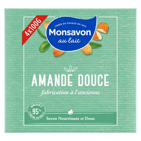Découvrez le savon solide Monsavon au Lait et Amande Douce, formulé pour nourrir la peau en douceur. Composé à 95 % d'ingrédients d'origine naturelle, il nettoie efficacement tout en laissant la peau douce, propre et délicatement parfumée grâce à ses notes subtiles d'amande. Adapté à un usage quotidien sur le corps et les mains, il est fabriqué à l'ancienne avec une base lavante d'origine végétale. Format : 4 x 100 g. Existe aussi en gel douche.