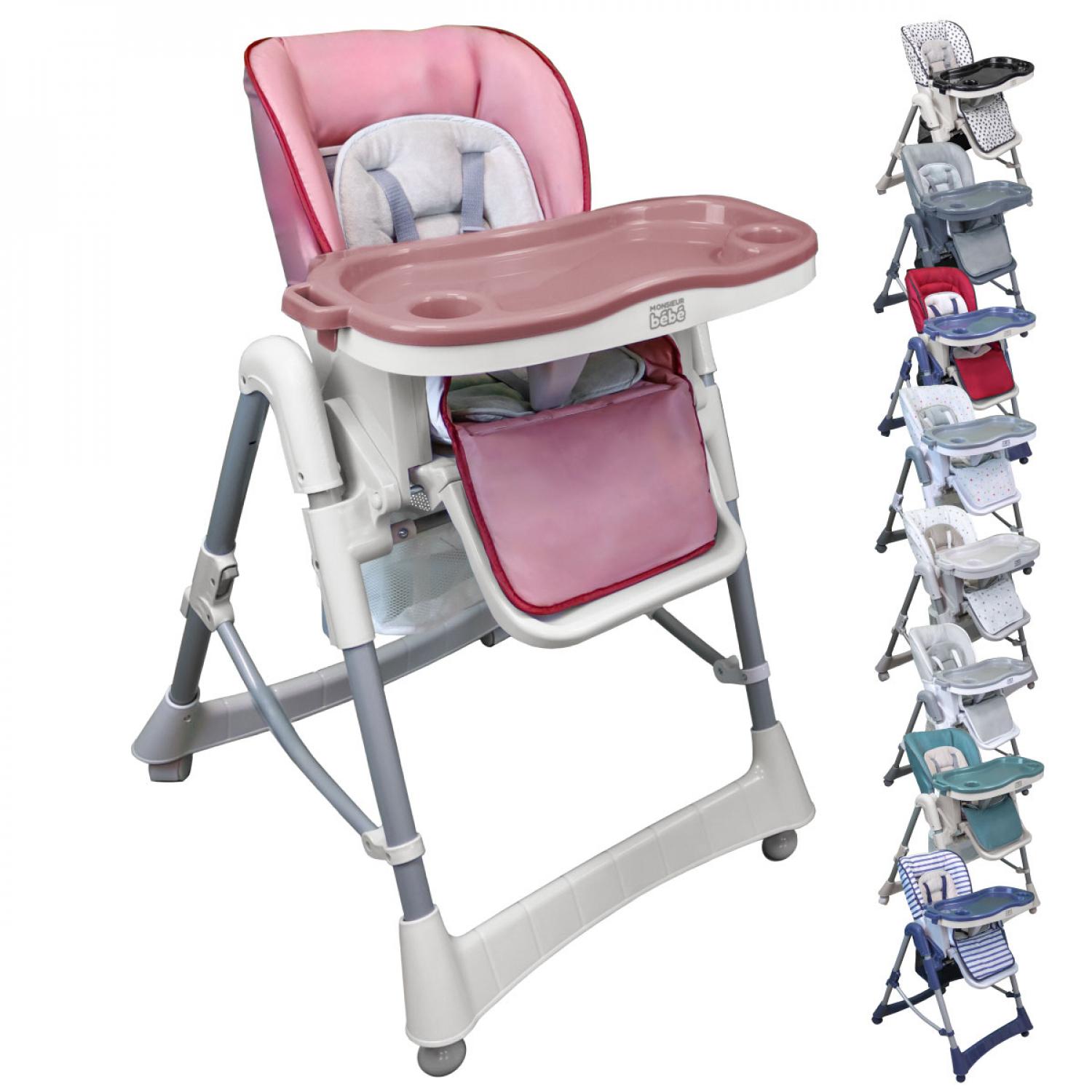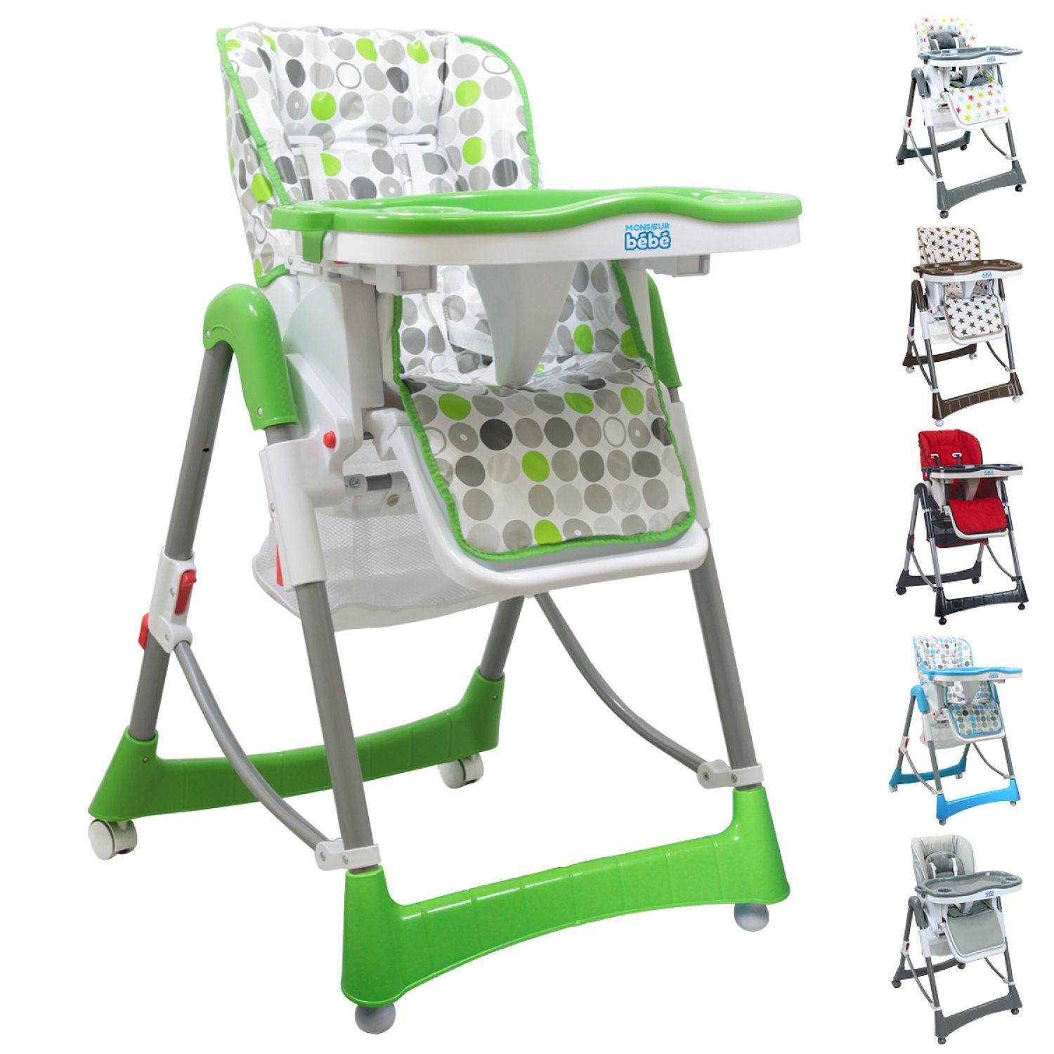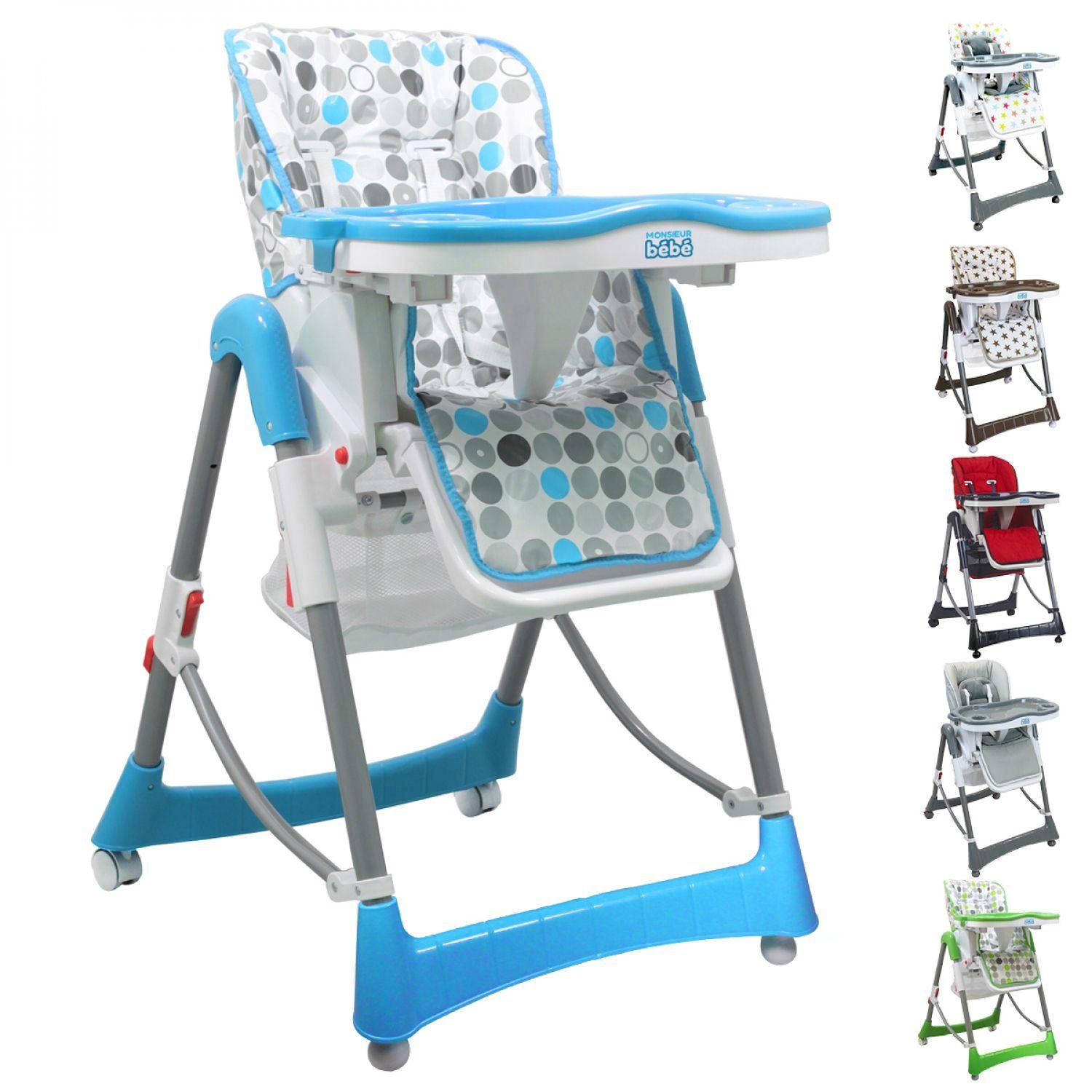 La chaise haute Ptit de Monsieur Bébé est un indispensable et permet à bébé de partager le repas avec toute la famille. Elle est idéale pour accompagner votre enfant dans l'apprentissage de son alimentation. Destinée à tous les parents qui souhaitent un produit pratique, confortable, robuste et fonctionnel, au design unique, la chaise possède une structure sûre en acier stable. Une housse anti-transpirante et lavable en machine est fournie ainsi qu'un petit coussin de confort supplémentaire pour le bien-être de votre enfant.La Chaise Haute est conforme aux exigences de sécurité et est destinée à des enfants capables de se tenir seuls en position assise, âgés au maximum de trois ans ou de poids inférieur ou égal à 15 kg. Cette chaise haute dispose de 3 positions réglables en hauteur (de 45 à 65 cm), 3 positions d'inclinaison du dossier et de 3 positions d'ajustement de la tablette (avec ses emplacements pratiques). La tablette est détachable et lavable. Ses accoudoirs sont relevables. Un panier détachable et suspendu sous la chaise vous permet de ranger quelques affaires de votre enfant. Le panier est toujours accessible même lorsque la chaise est pliée. Cette chaise dispose de 2 roues avec système de blocage, de 2 pieds antidérapants et d'un repose pieds. La chaise haute mesure 75 cm de profondeur, 60 cm de largeur et 100 cm de hauteur. La profondeur du siège est de 25 cm. La chaise est pliante (35 cm d'épaisseur une fois pliée) afin d'optimiser la place à la fin du repas de l'enfant. Le harnais de sécurité dispose de 5 points. Notre ambition est de répondre à vos besoins du quotidien en vous proposant des gammes de plus en plus variées et tendance. Un large éventail de produits est à retrouver à travers nos différentes marques.
