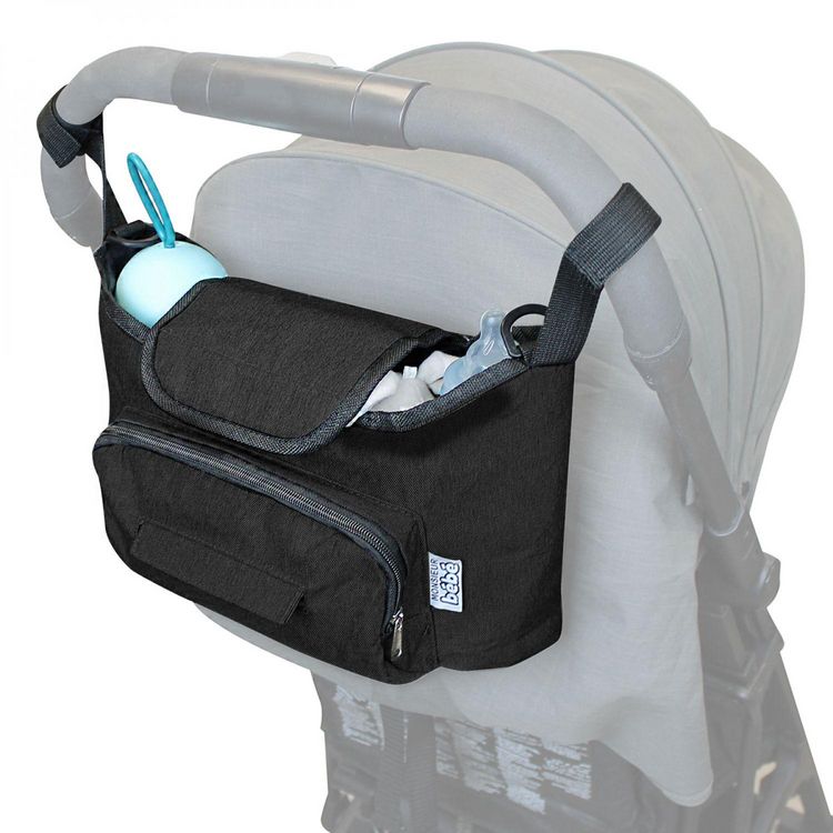Le sac pour poussette Monsieur Bébé est un accessoire indispensable pour vos balades en famille. Petit, mais pratique. Rangez-y couches, biberon, lingettes, clés, papiers. Tout est à portée de main. Deux types d'accroches sont possibles, au guidon de la poussette ou en bandoulière. Les dimensions du