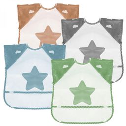 Ce lot de 8 bavoirs imperméables Monsieur Bébé à manches longues est un indispensable pour protéger votre enfant et l'aider à rester au propre lors des repas ou des ateliers créatifs. Avec des manches resserrées et élastiques en bout, votre bébé est pleinement protégé. Conçu de manière à faciliter votre quotidien, chaque bavoir dispose d'un scratch velcro tout doux pour pouvoir l'enlever et le mettre facilement à votre enfant ainsi qu'une ficelle à nouer dans le bas du dos, afin que le bavoir reste bien en place. Réalisé en polyester, ce lot de 8 bavoirs est complètement imperméable, facile à essuyer, résistant aux tâches et passe en machine à 30°. Chacun de ces bavoirs dispose aussi d'une poche récupératrice en PVC permettant de rattraper les aliments qui tombent pour plus de praticité. Un bavoir mesure de 33 cm largeur, 35 cm de hauteur, les manches mesurent 15 cm de longueur et la poche 9 cm de hauteur. Convient pour les 6-36 mois. Ce lot se compose de 8 bavoirs avec étoile et nuages : deux verts, deux bleus, deux gris et deux oranges. Article également disponible en manches longues, et en plusieurs lots.