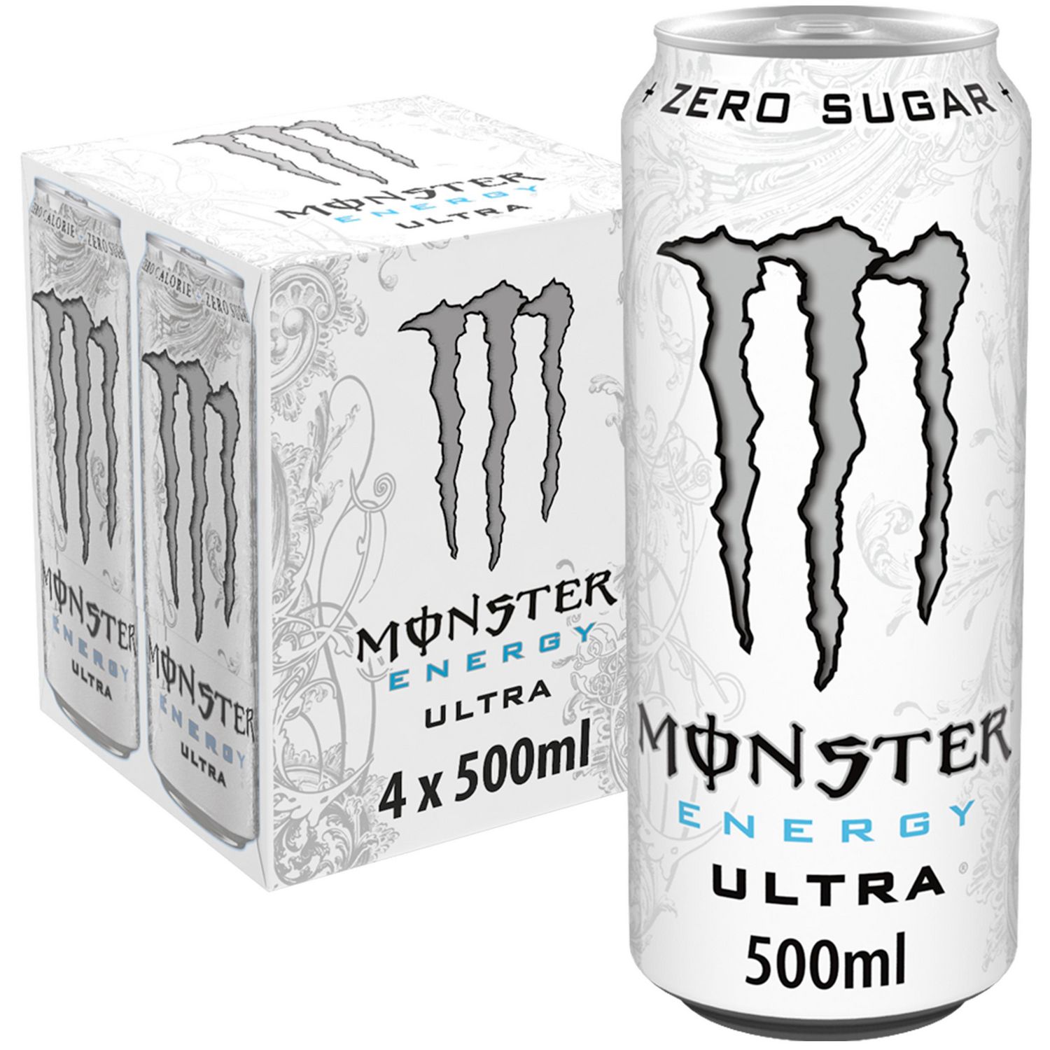 Monster Energy 4xUltra 500 ml, boisson énergétique sans sucre avec mélange énergétique et 160 mg de caféine.Monster Energy Ultra n'a pas le même goût que les boissons énergisantes traditionnelles, mais contient tout de même le mélange énergétique Mon