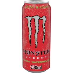Monster Energy Watermelom 500 ml, boisson énergisante sans sucre avec mélange énergétique et 160 mg de caféine.Ultra Watermelon a une saveur rafraîchissante et n'a pas le goût des boissons énergisantes traditionnelles, mais contient tout de même le m
