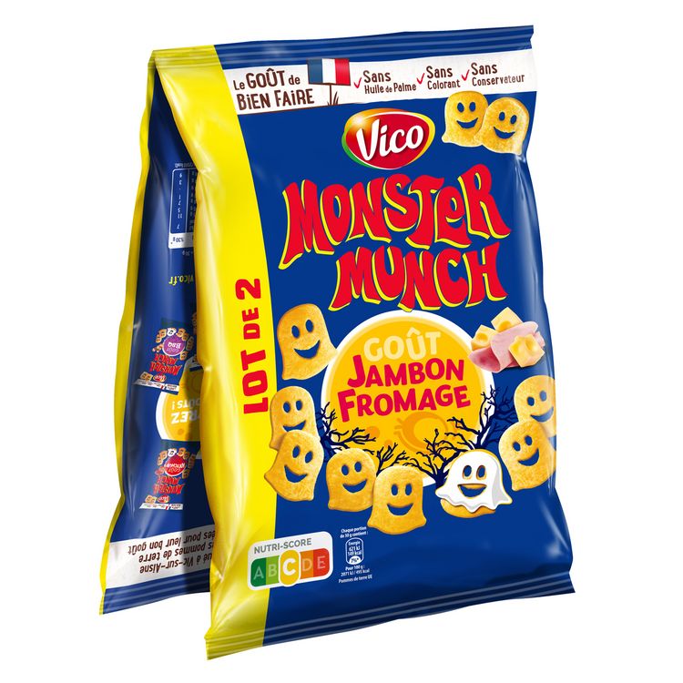 Petits monstres saveur jambon-fromage au bon goût de pomme de terre. D'une texture légère et croustillante, les Monster Munch peuvent être dégustés en différentes occasions. A l'apéritif en compagnie des parents ou lors d'un petit creux après le sport, ils seront aussi appréciés comme accompagnement en complément d'un repas équilibré. Une recette certifiée qualité Vico, sans colorant, sans conservateur, sans huile de palme et fabriquée en France.