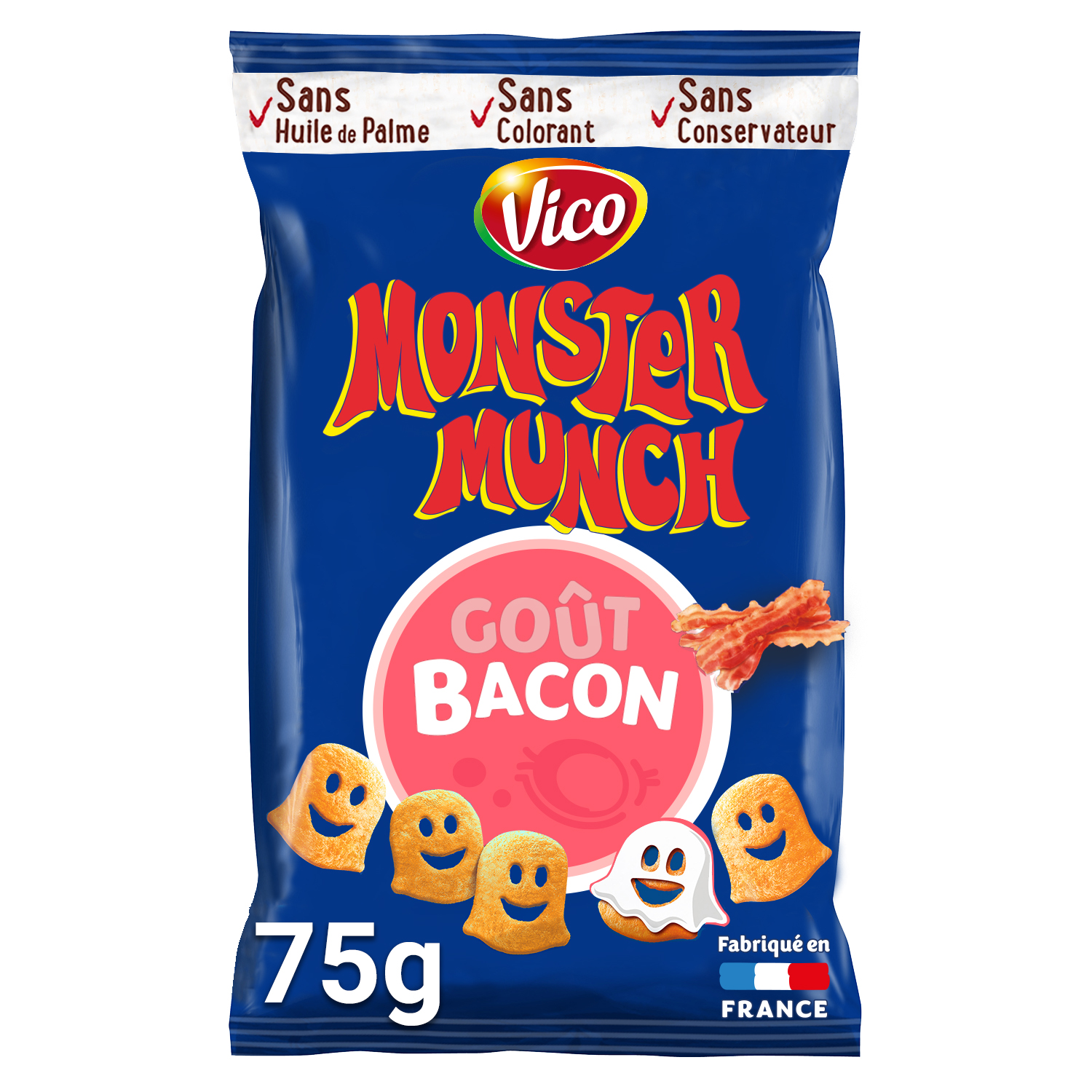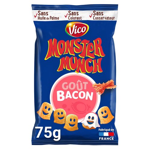 Petits monstres saveur Bacon au bon goût de pomme de terre . D'une texture légère et croustillante, les Monster Munch peuvent être dégustés en différentes occasions. A l'apéritif en compagnie des parents ou lors d'un petit creux après le sport, ils seront aussi appréciés comme accompagnement en complément d'un repas équilibré. Une recette certifiée qualité Vico, sans colorants, sans conservateurs, sans huile de palme et fabriquée en France.
