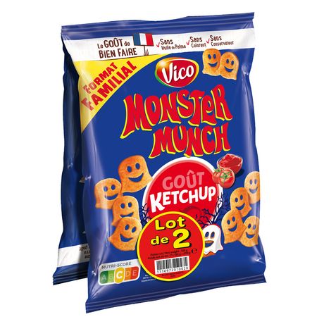 Petits monstres Ketchup au bon goût de pomme de terre . D'une texture légère et croustillante, les Monster Munch peuvent être dégustés en différentes occasions. A l'apéritif en compagnie des parents ou lors d'un petit creux après le sport, ils seront aussi appréciés comme accompagnement en complément d'un repas équilibré. Une recette certifiée qualité Vico, sans colorants, sans conservateurs, sans huile de palme et fabriquée en France.