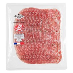 Viande de porc, sel, lactose, poivre vert 1%, épices, dextrose, ail, conservateurs : nitrate de potassium, nitrite de sodium , antioxydant : ascorbate de sodium ; ferments. 136g de viande de porc utilisée pour 100g de produit fini. Peut contenir des traces de soja