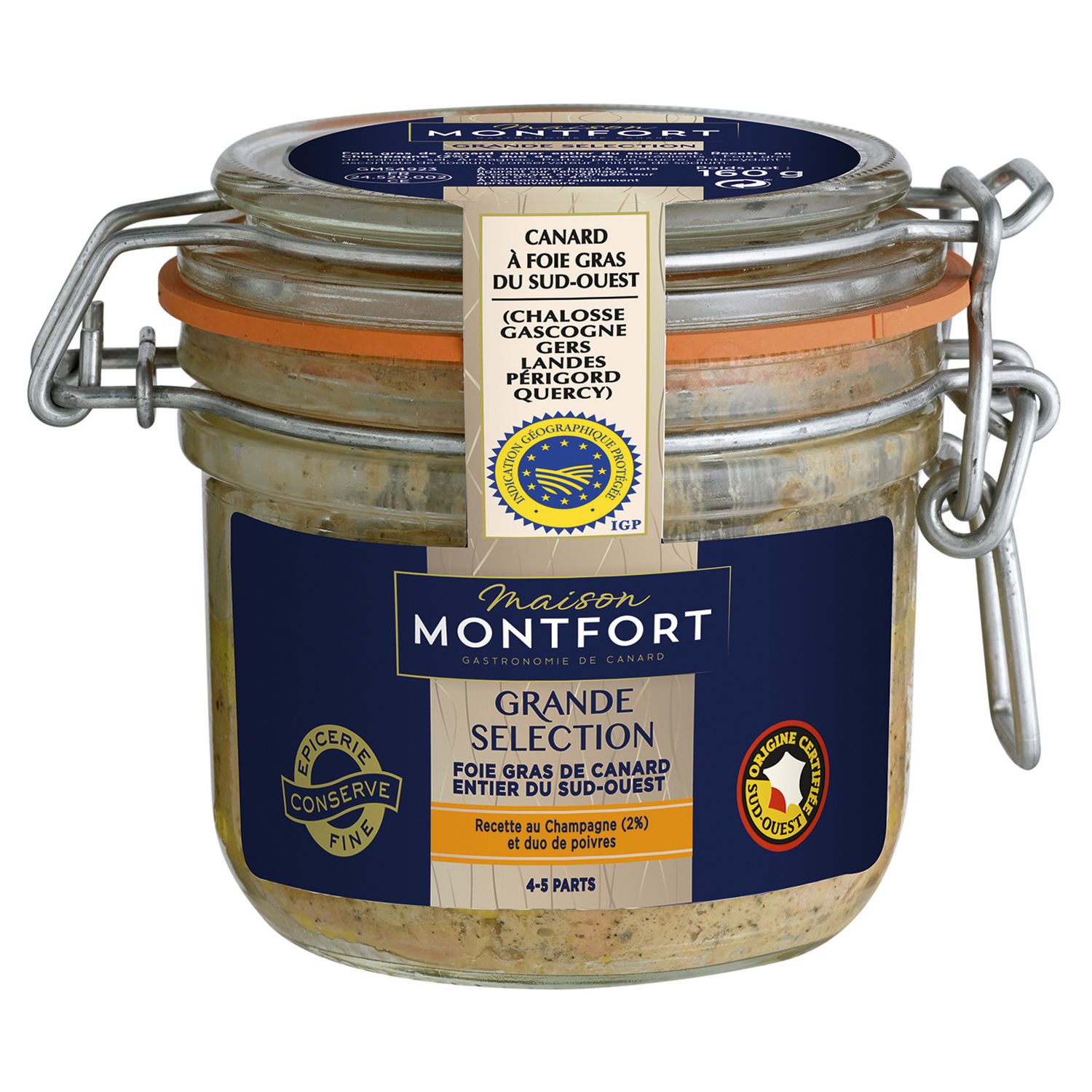 Foie gras de canard Origine : France Sud Ouest IGP (Chalosse, Gascogne, Gers, Landes, Périgord, Quercy) (Indication dans la liste des ingrédients : "Origine : France")