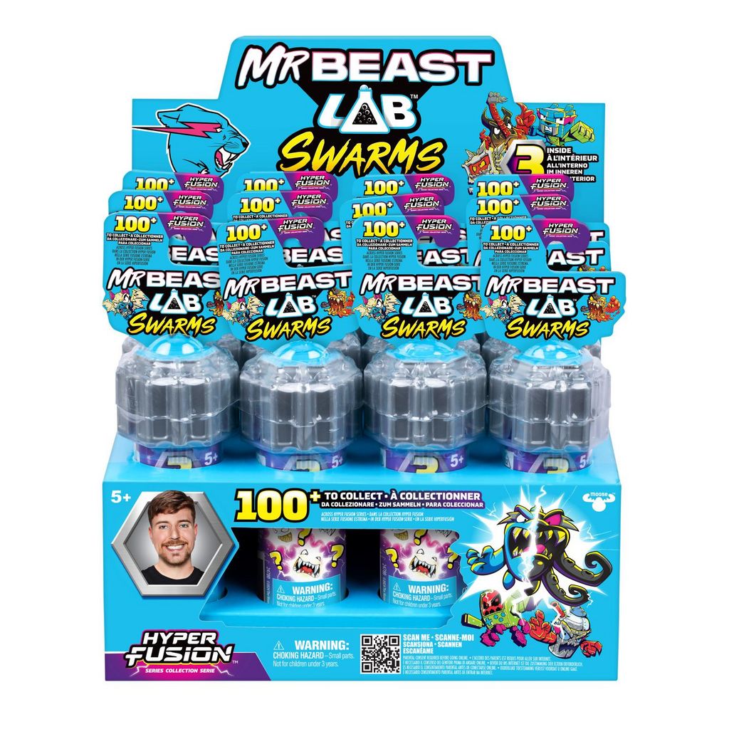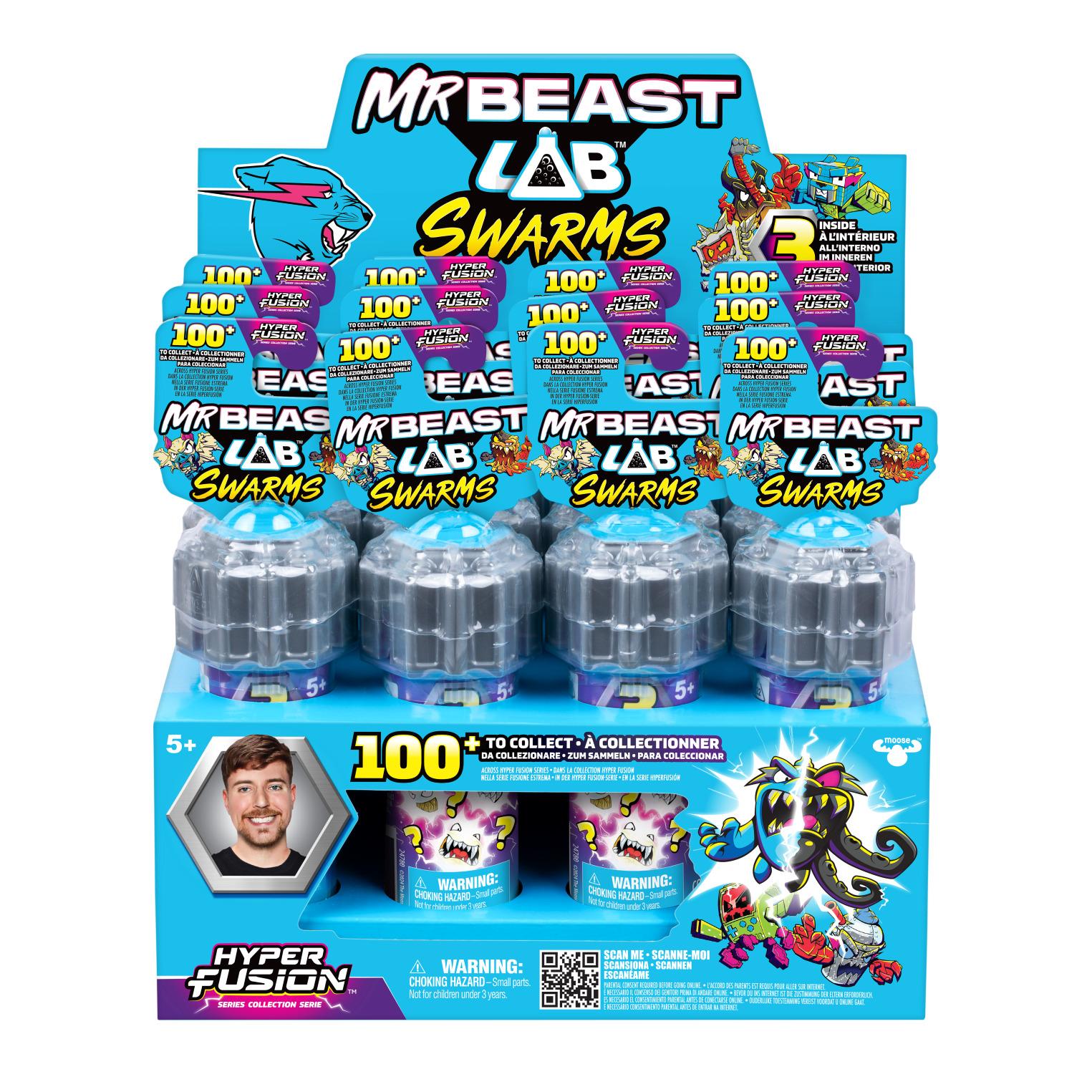 Ouvre le tube à essai et surprise : 3 mini figurines MrBeast Lab Swarms Fusion de 2,5 cm apparaissent ! Plus de 100 à collectionner ! Utilise la capsule pour exposer et créer ton univers de Swarms !