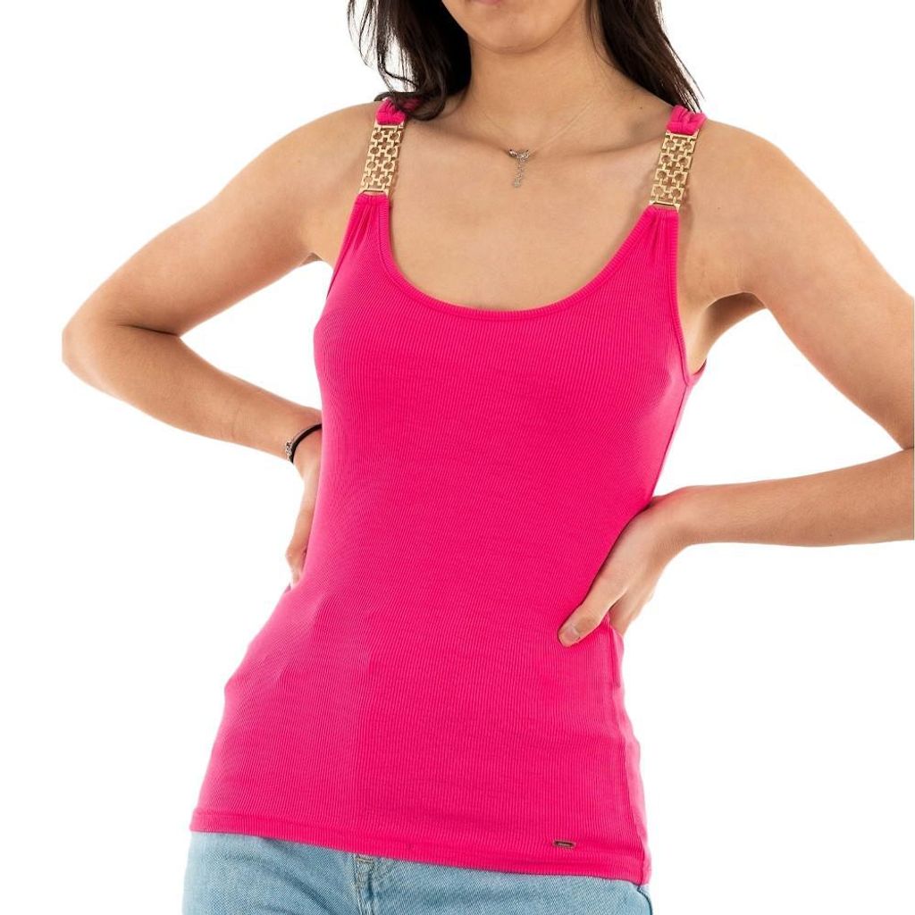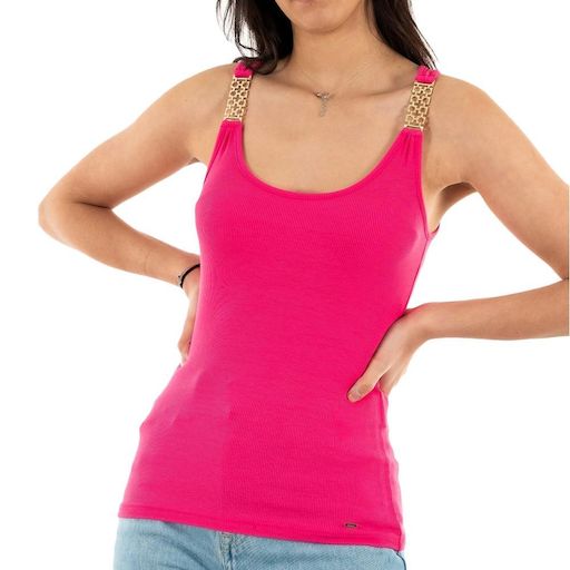 Craquez pour ce débardeur de la marque Morgan ! Coloris : rose Col rond Sans manches Bretelles sur le haut du débardeur avec ornements Coupe ajustée Col V Bretelles larges Composition : 50% modal, 50% coton