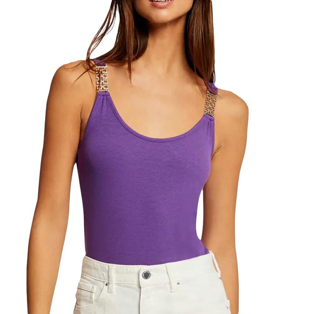 Craquez pour ce débardeur de la marque Morgan ! Coloris : violet Col rond Sans manches Bretelles sur le haut du débardeur avec ornements Coupe ajustée Col V Bretelles larges Composition : 50% modal, 50% coton