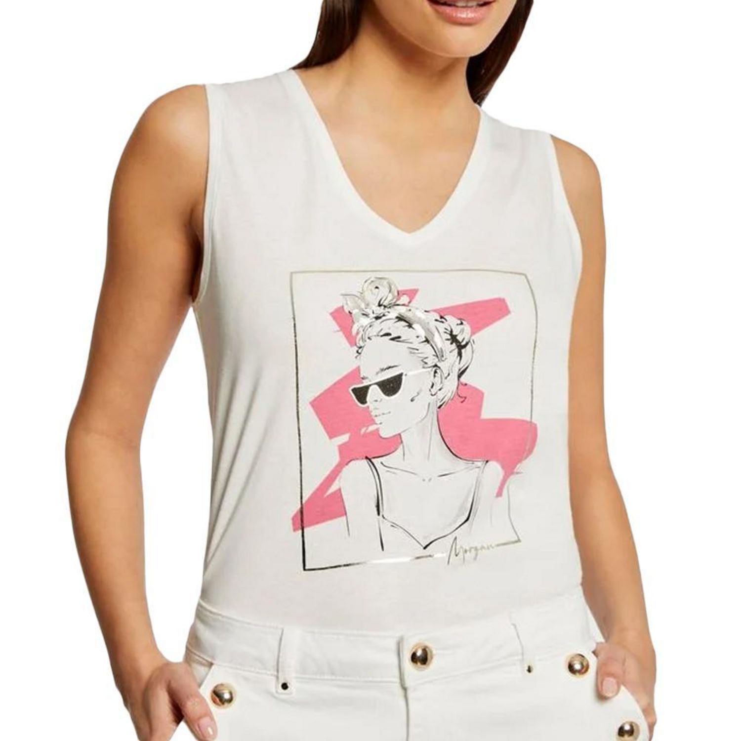 Optez pour ce débardeur de la marque Morgan ! Coloris : blanc Col V Manches courtes Composition: 50% coton, 50% modacrylique