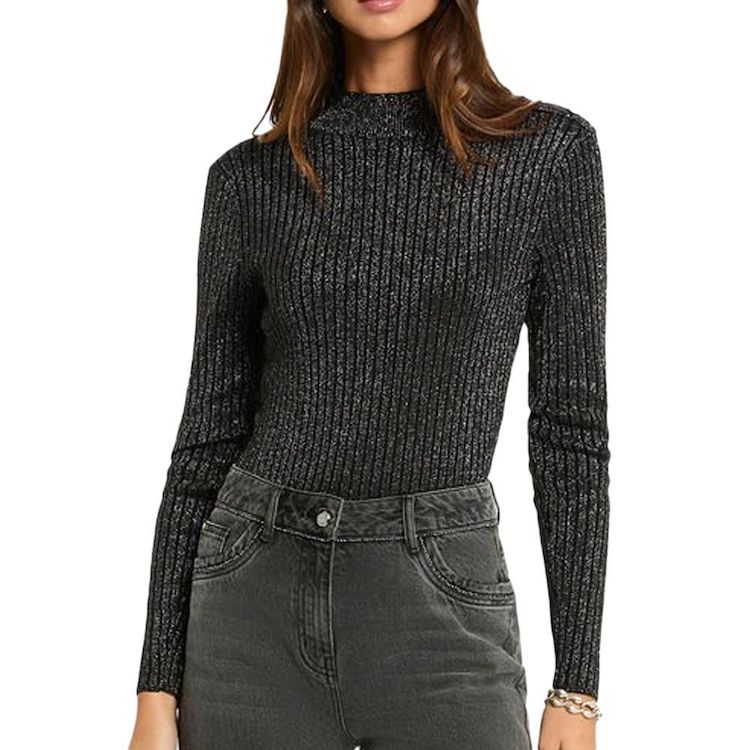 Optez pour le pull femme Morgan !Coloris : NoirMaille brillanteCol montantManches longuesComposition : 65 % viscose, 12 % polyester, 6 % fibre métallique, 17 % polyamide