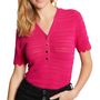 Offrez vous le pull femme de la marque Morgan Col V Manches courtes Maille fine Détails ajourés Coloris : Fuchsia Boutons à l'encolure Bas des manches et du pull en vague Composition : 80% viscose , 20% polyamide
