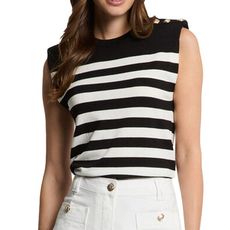 Craquez pour le pull sans manche de la marque MORGAN !Coloris : Noir/Blanc Coupe droiteCol rondBoutons décoratifs sur l'épauleMotif à rayuresComposition : 65% Viscose 35% Polyamide