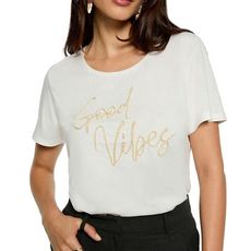 Optez pour ce T-shirt de chez Morgan !Coloris : BlancMotif : Good Vibes en doréManches longuesCol rondComposition : 50% Modal , 50% Coton
