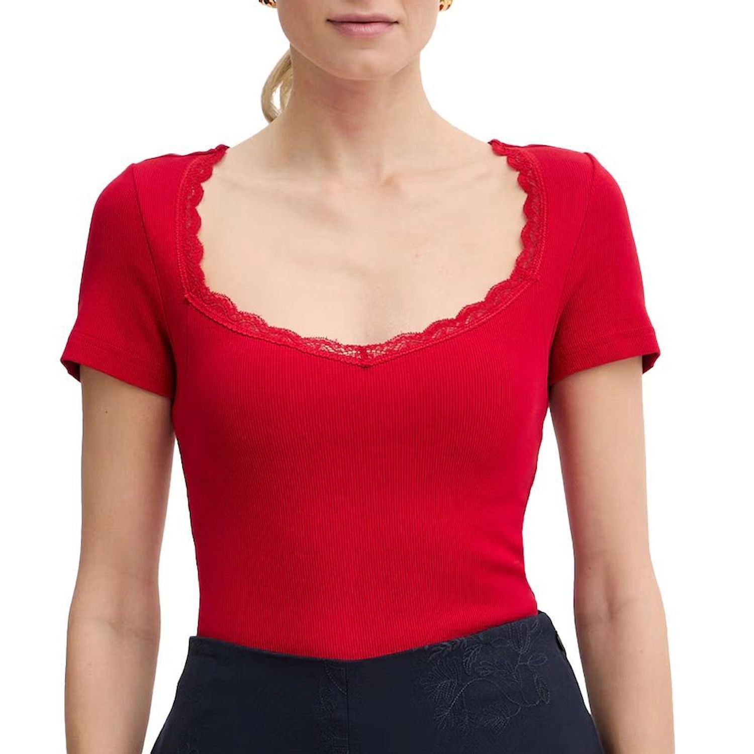Opte pour le t-shirt femme Morgan !Col V dentelleManches courtesColoris : RougeTissu côteléComposition : 54% COTON 43% VISCOSE 3% ELASTHANNE