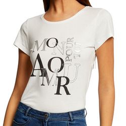 T-shirt pour femme de la marque Morgan Manches courtes Col rond Coloris : Blanc Inscription sur l'avant avec strass Composition : 50% coton , 50% modal