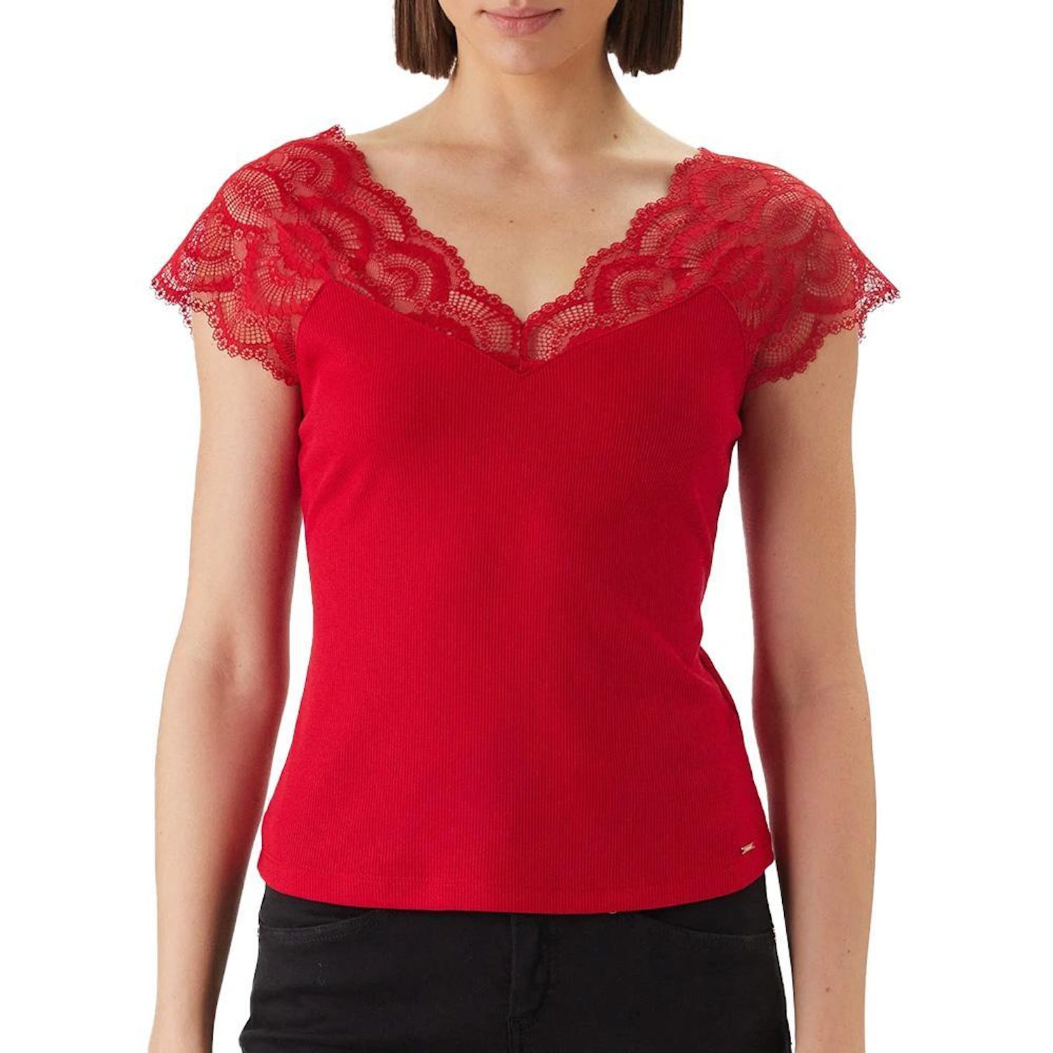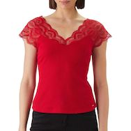Optez pour ce t-shirt Morgan !Composition : 61% POLYESTER 33% VISCOSE 6% ELASTHANNEColoris : RougeCol VManches courtes dentelle