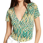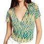 Top femme de la marque Morgan- Manches courtes- Col V- Imprimé- Tissu ajusté- Coloris : Vert/Jaune- Composition : 95% polyester , 5% élasthanne