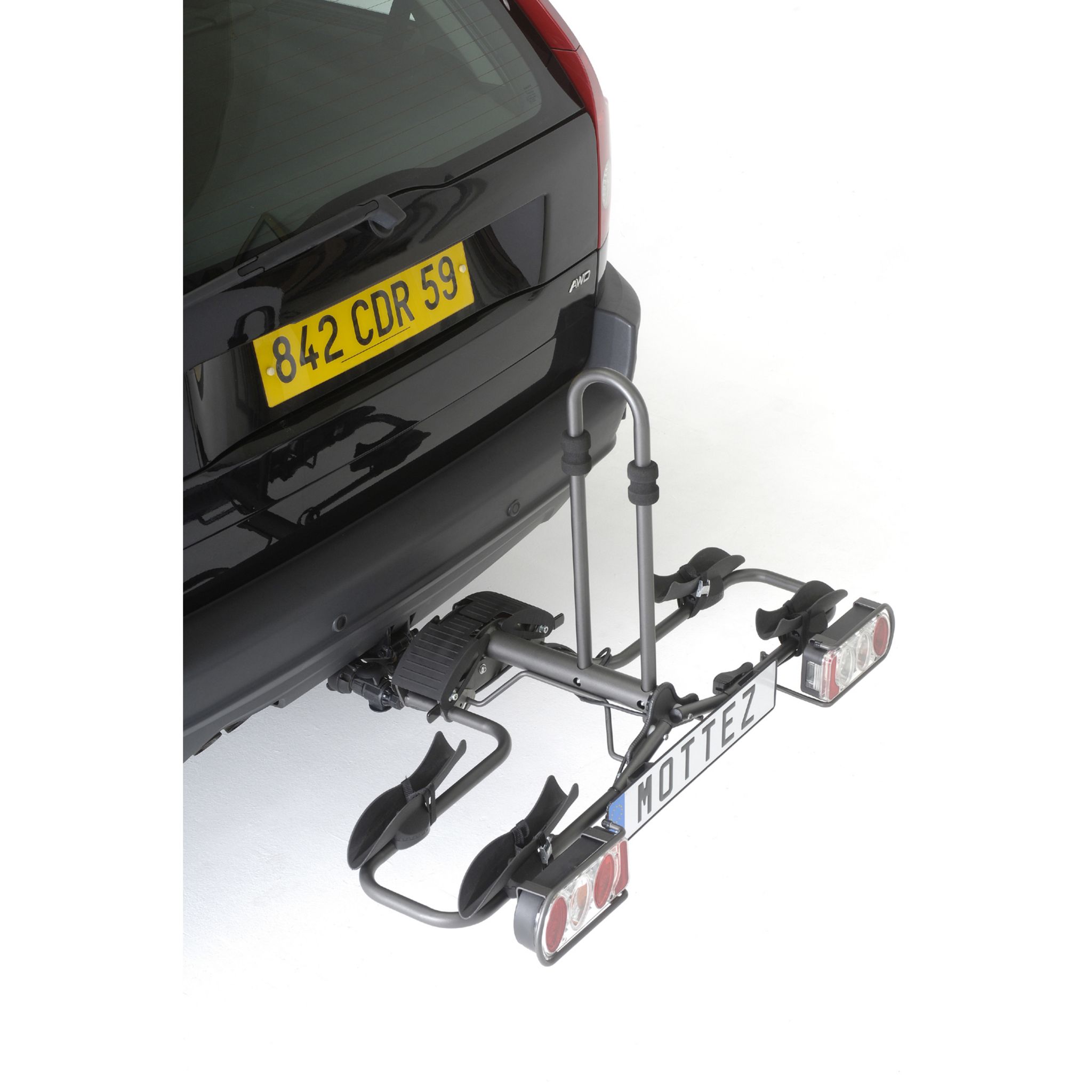 Ce porte-vélos Mottez d'attelage à plate-forme rabattable peut transporteur deux vélos sans aucunes difficultés. Son système de clips sur la boule d'attelage vous permet de le monter et de le démonter en quelques minutes sans aucune difficultés.