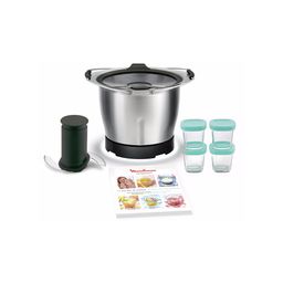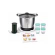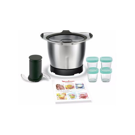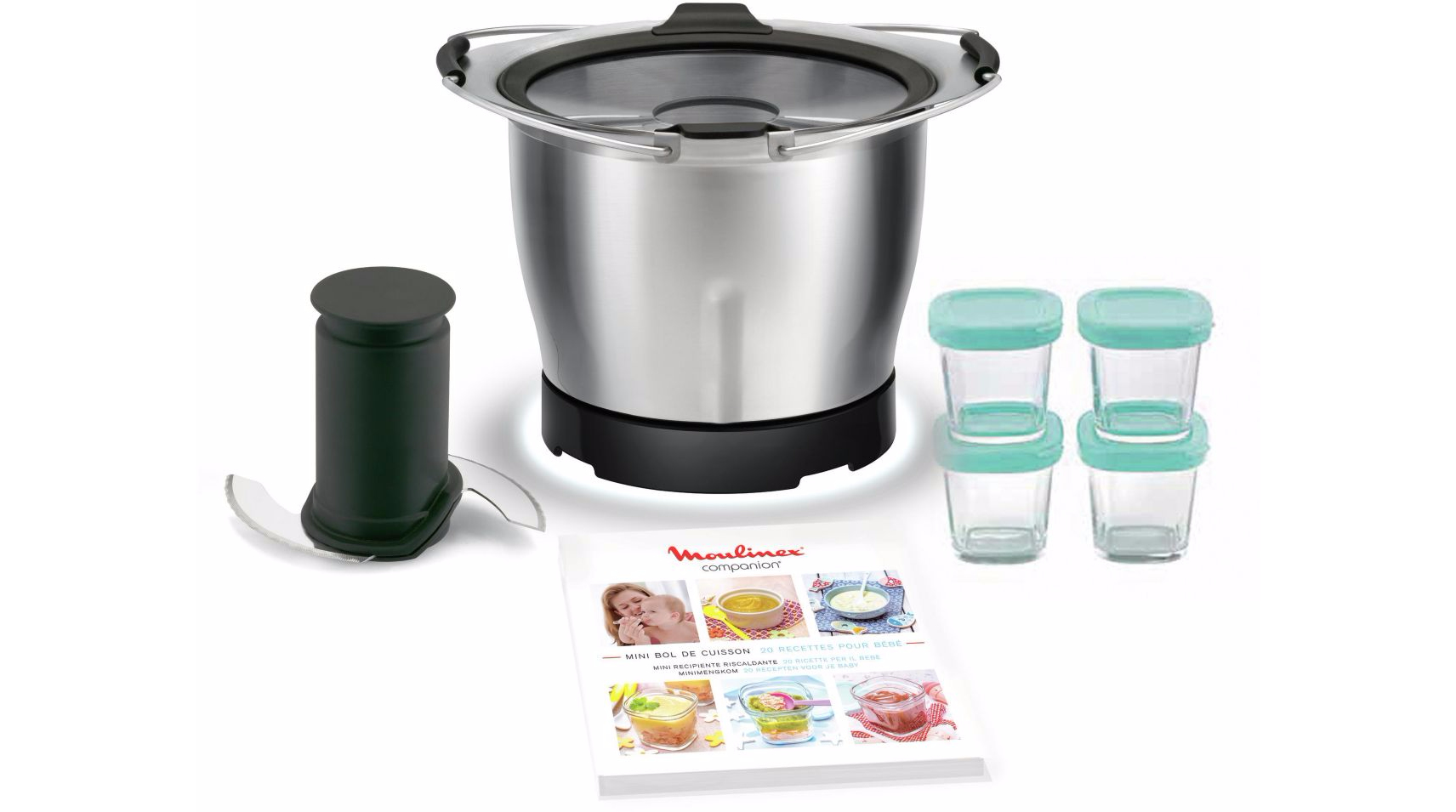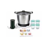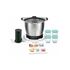 Bol inox 1.4 L, Double lame inox, Couvercle verre, Poignées revêtement silicone, Livret de recettes et 4 petits pots avec couvercle