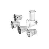 Le Moulinex XF6320B1 est un accessoire pour robot culinaire conçu pour améliorer vos préparations en cuisine. Fabriqué en inox et acier inoxydable, il comprend quatre cônes interchangeables permettant de râper fin ou épais et de trancher divers ingrédients avec précision. Compatible avec les modèles