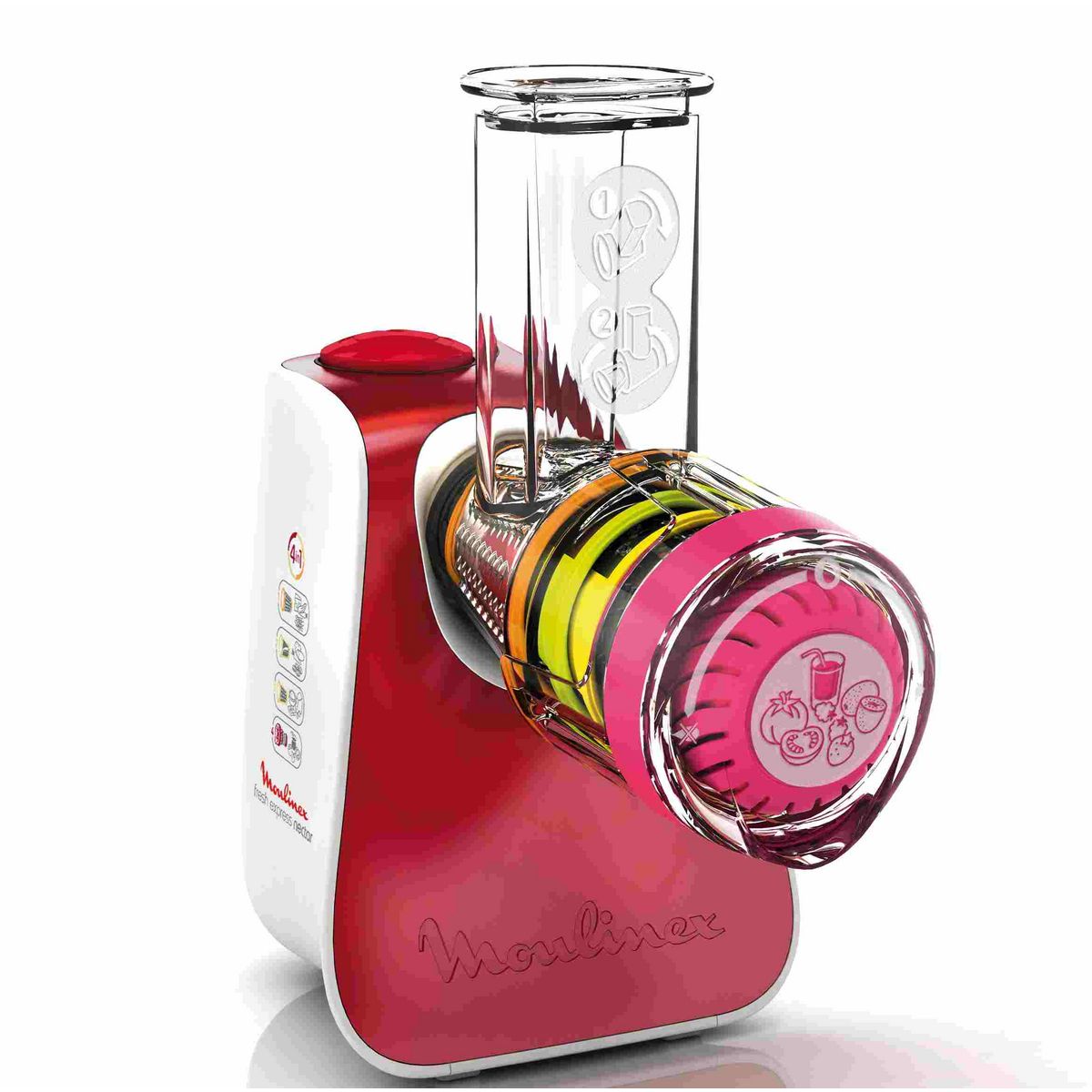 Un appareil compact et simple à utiliser pour râper et trancher directement dans votre plat de service.