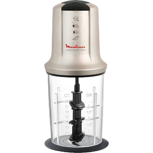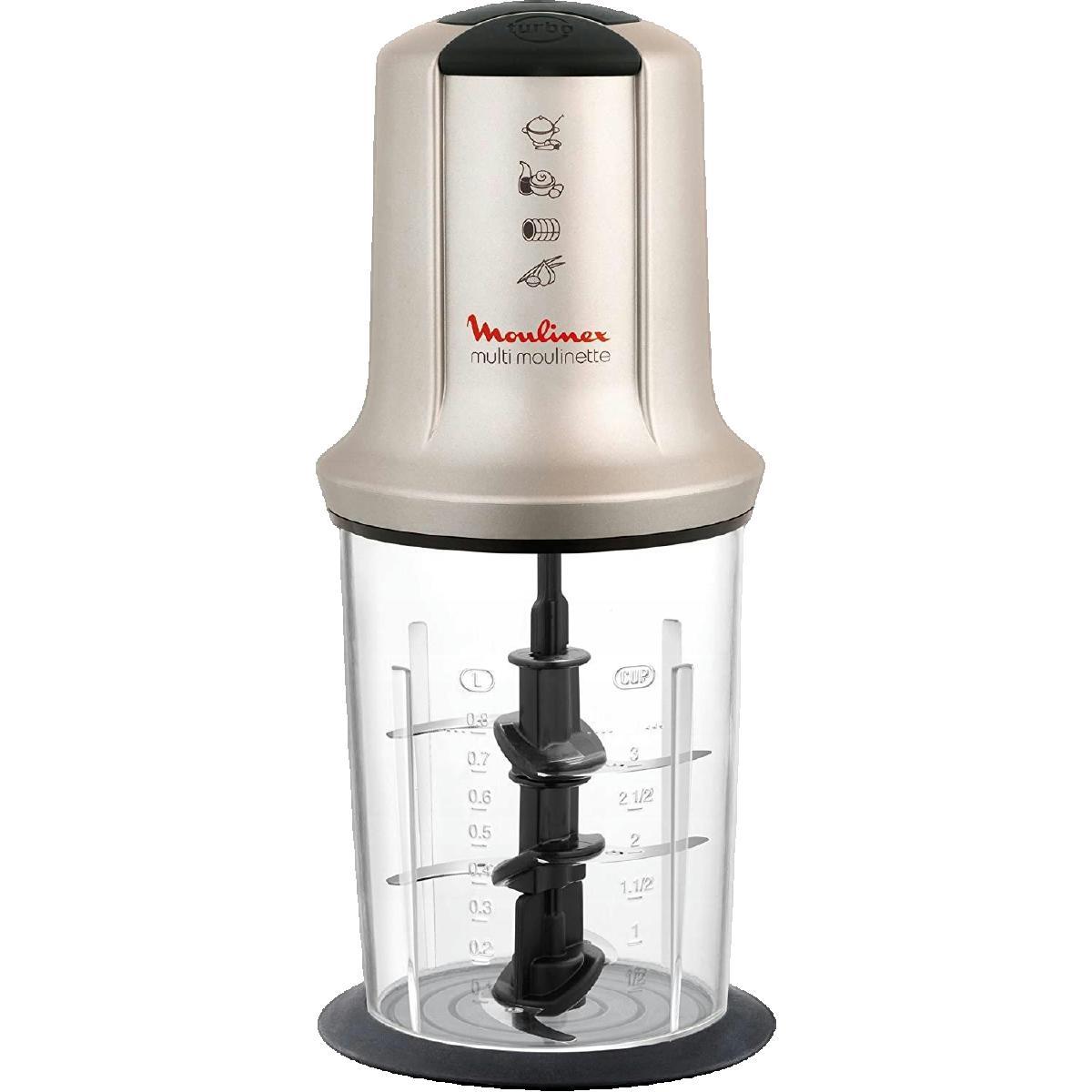 Le mini-hachoir Multimoulinette XXL AT718A10 de Moulinex est parfait pour la préparation culinaire à domicile. Il dispose d'une grande capacité de 300g ou 800ml, permettant de hacher, émulsionner et mixer rapidement. Équipé de 3 doubles lames en acier inoxydable et 2 vitesses, il assure une efficacité optimale même avec les ingrédients les plus coriaces. Son bol en plastique étanche est compatible lave-vaisselle pour un nettoyage facile. Le hachoir inclut également un bol gradué, un couvercle et un livre de recettes. Puissance maximale : 1600 W. Poids : 1.5 kg.