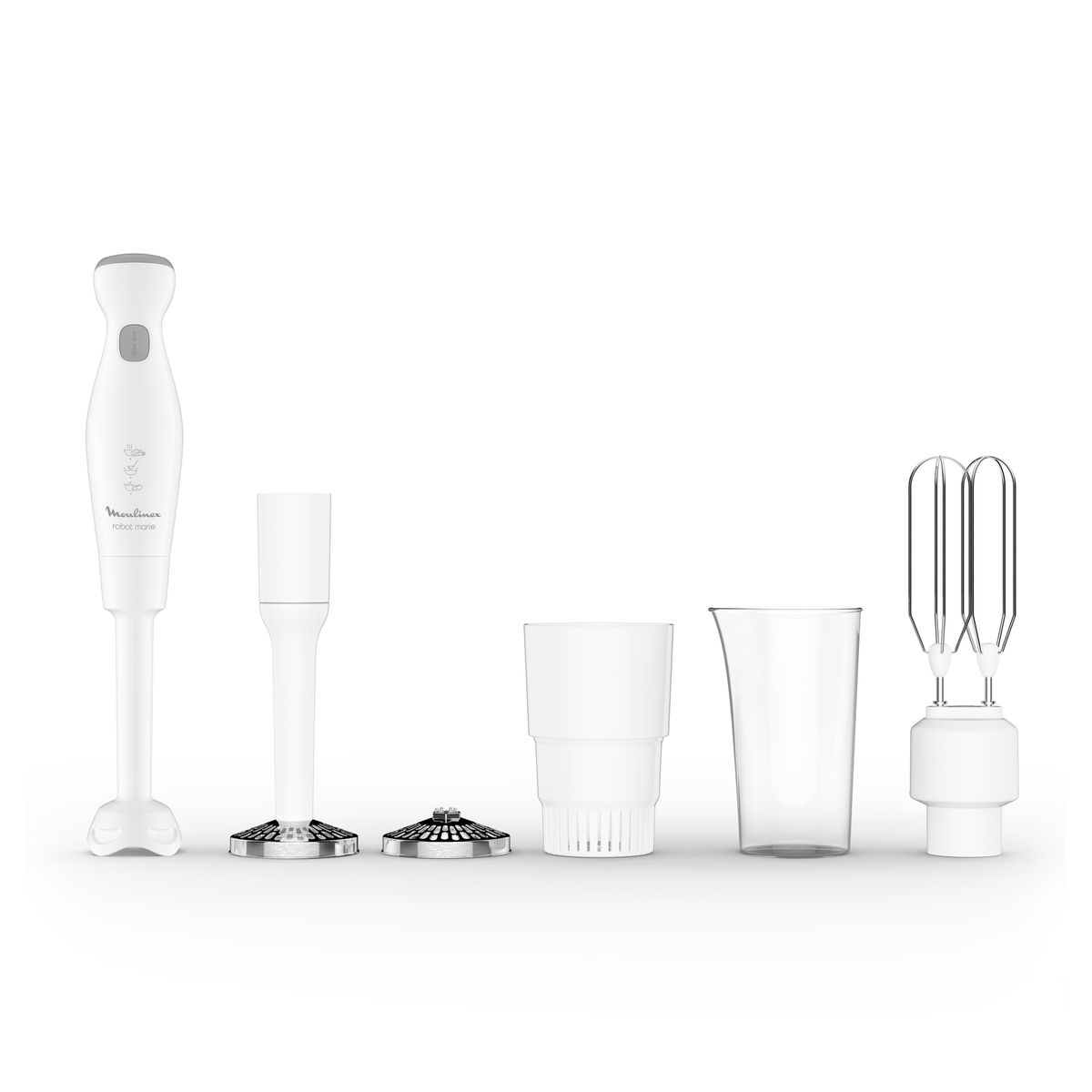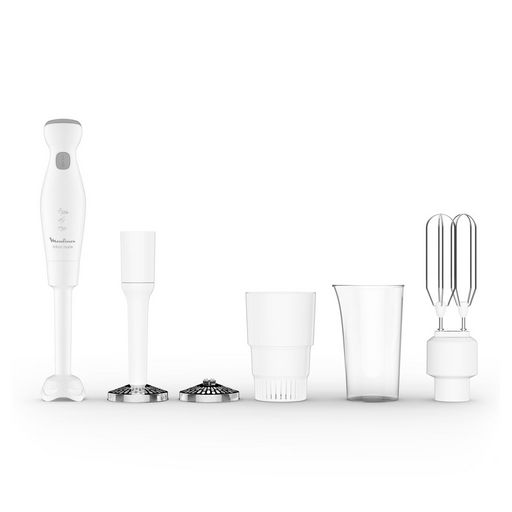 Mixez avec efficacité et préparez de bonnes recettes avec ce mixeur plongeant MOULINEX ! Il se compose d’un fouet, d’un verre doseur et de 2 lames aiguisées, afin d'obtenir rapidement des préparations onctueuses et homogènes.