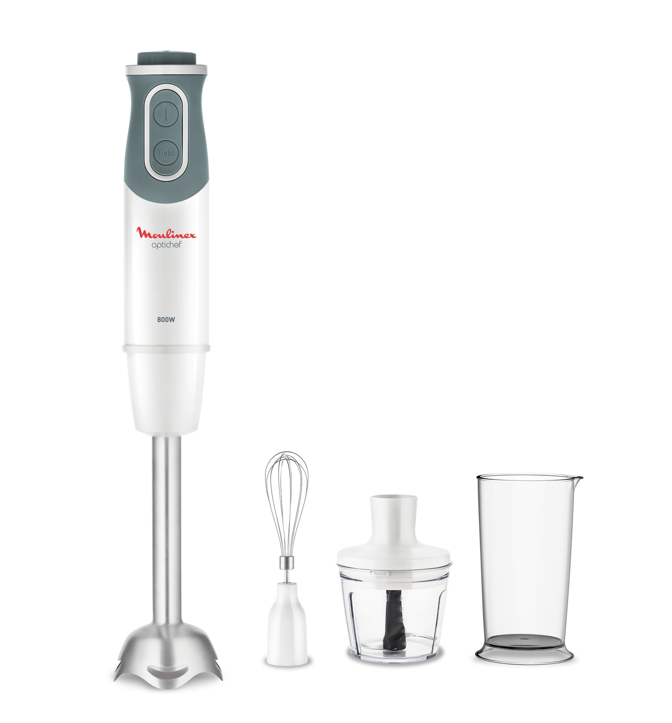 Le design de son pied inox et de ses lames assurent un mixage parfait, sans effort!! L'Optichef est polyvalent : profitez d'un mini hachoir de 500 ml, d'un fouet et d'un gobelet doseur de 800 ml.