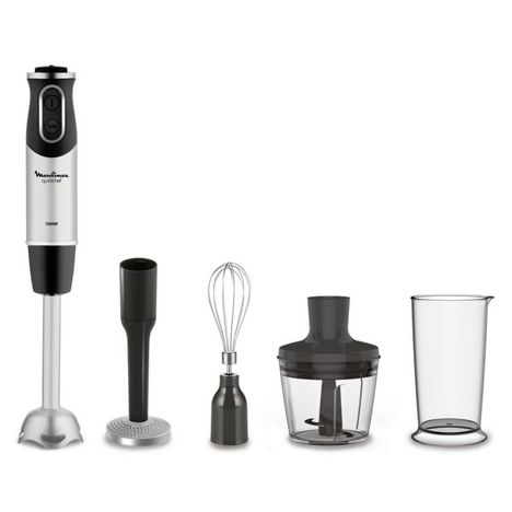 En savoir +Moulinex DD65H810 Mixeur plongeant 4en1 QUICKCHEF Moulinex DD65H810 comprenant un pied mixeur, mini-hachoir, fouet et un verre doseur.Cuisinez sans effort !Grâce au pied mixeur Quickchef 4 en 1 de Moulinex, profitez d'un maximum de puissance pour un minimum d'effort ! Son moteur de 1000W vous permet de mixer une grande variété de recettes en quelques instants.Gardez le contrôle grâce à son variateur rétroéclairé de 10 vitesses, ajustables même lorsque l'appareil est en fonctionnement !Le pied anti-éclaboussures et le revêtement Soft Touch de la poignée assurent un grand confort d'utilisation.Toutes les parties amovibles sont compatibles au lave-vaisselle pour un nettoyage en toute tranquilité.Variez les recettes grâce aux 3 accessoires inclus : un mini hachoir d'une capacité de 500 ml pour hacher toutes sortes d'ingrédients, un fouet pour battre les blancs en neige ou réaliser de la crème fouettée et un pied purée pour des purées maison !Toujours plus pratique, un verre doseur de 800 ml est inclus.Un pied mixeur très puissant pour un mixage exceptionnelProfitez de la performance exceptionnelle de Quickchef : grâce à ses 1000W, mixez sans effort vos soupes, compotes, purées et plein d'autres recettes !Pied inox anti-éclaboussuresQuickchef vous assure un confort et une facilité d'utilisation optimaux !Nettoyage facileTous les éléments amovibles sont compatibles lave-vaisselle.Variateur de vitesse rétroéclairéAjustez la vitesse d'un simple coup de main, même lorsque l'appareil est en fonctionnement !Poignée ergonomique avec revêtement Soft TouchPrise en main facile et contrôle optimal grâce à la poignée ergonomique et à son revêtement Soft Touch, même avec les mains mouillées !Finitions inoxDes finitions noires et inox pour un aspect premium et de qualité.Mini hachoir de 500 ml (capacité totale)Obtenez le résultat de mixage souhaité en quelques secondes grâce au mini hachoir inclus.BatteurLe batteur assure des résultats optimaux sur la crème fouettée ou les blancs en neige.Pied presse puréePour une touche d?authenticité réalisez des purées maison parfaitement lisses et onctueuses ou des coulis de fruits avec le pied presse purée.