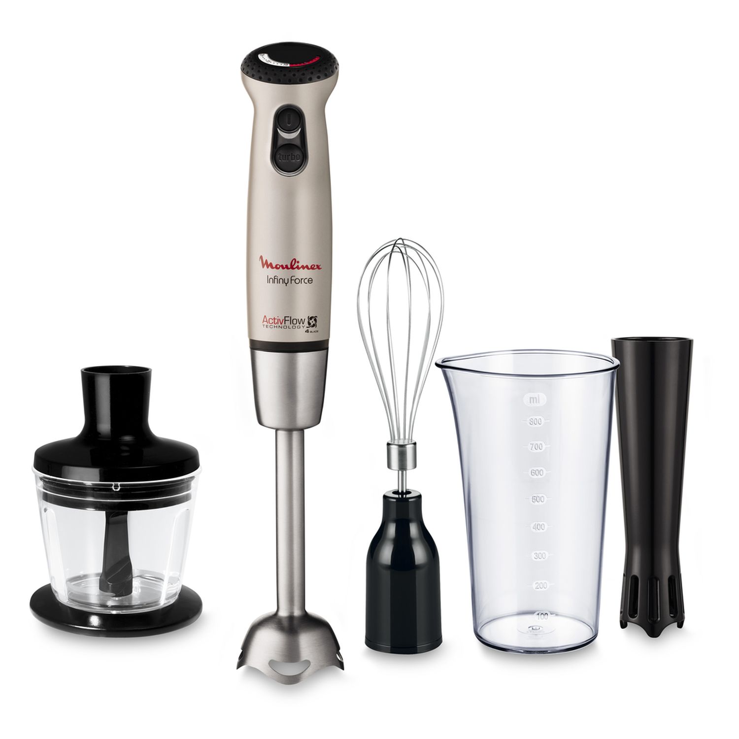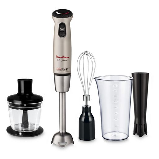 750 W, Variateur de 20 vitesses, Fonction pulse, Fonction turbo, Accessoires inclus : Pied mayonnaise, hachoir, Gobelet 800 ml, fouet