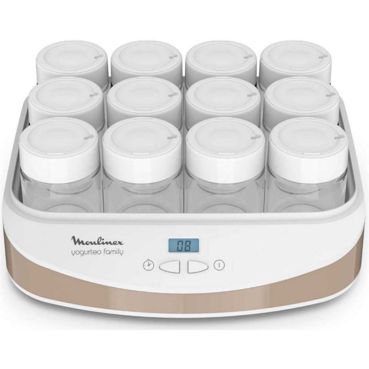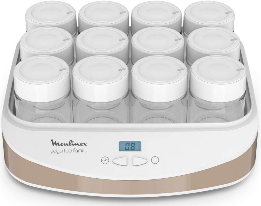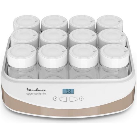 Moulinex YG233A10 Yaourtière Yogurteo Family Moulinex YG233A10 dotée de 12 pots en verre de 200 ml pour faire vos yaourts maison et régaler toute la famille. Simple d?utilisation pour une préparation de yaourts simple et sans effort. Fonctions intelligentes : timer numérique simple d?utilisation programmable jusqu'à 15 heures avec arrêt automatique et signalsonore. Les pots sont équipés de couvercles dateurs. Pratique, les pots ainsi que les couvercles se rangent facilement dans la yaourtière.