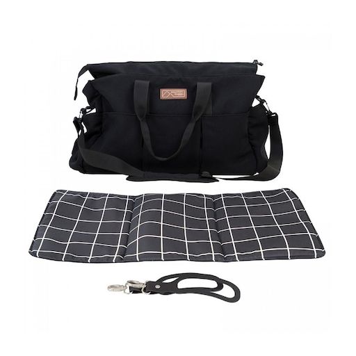 Compartiments avec fermeture à tirette,. Tapis de changement. 2 x clips qui se fixent à la poignée de votre poussette.