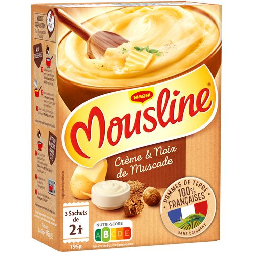 Purée de pomme de terre en flocons à la crème et noix de muscade, aromatisée Notre purée MOUSLINE Crème et Noix de Muscade est composée de 90% de pomme de terre. Les pommes de terre françaises, majoritairement récoltées en Picardie, sont livrées à l'atelier de fabrication MOUSLINE. Elles sont soigneusement lavées, épluchées puis cuites à la vapeur. Elles sont ensuite écrasées en purée, dont on extrait l'eau pour la réduire en flocons. On ajoute ensuite la crème et la noix de muscade, ce qui permet d'obtenir une purée onctueuse et au goût unique. Produite en Picardie. Carton recyclable. Une boîte contient 3 sachets pour 2 personnes.