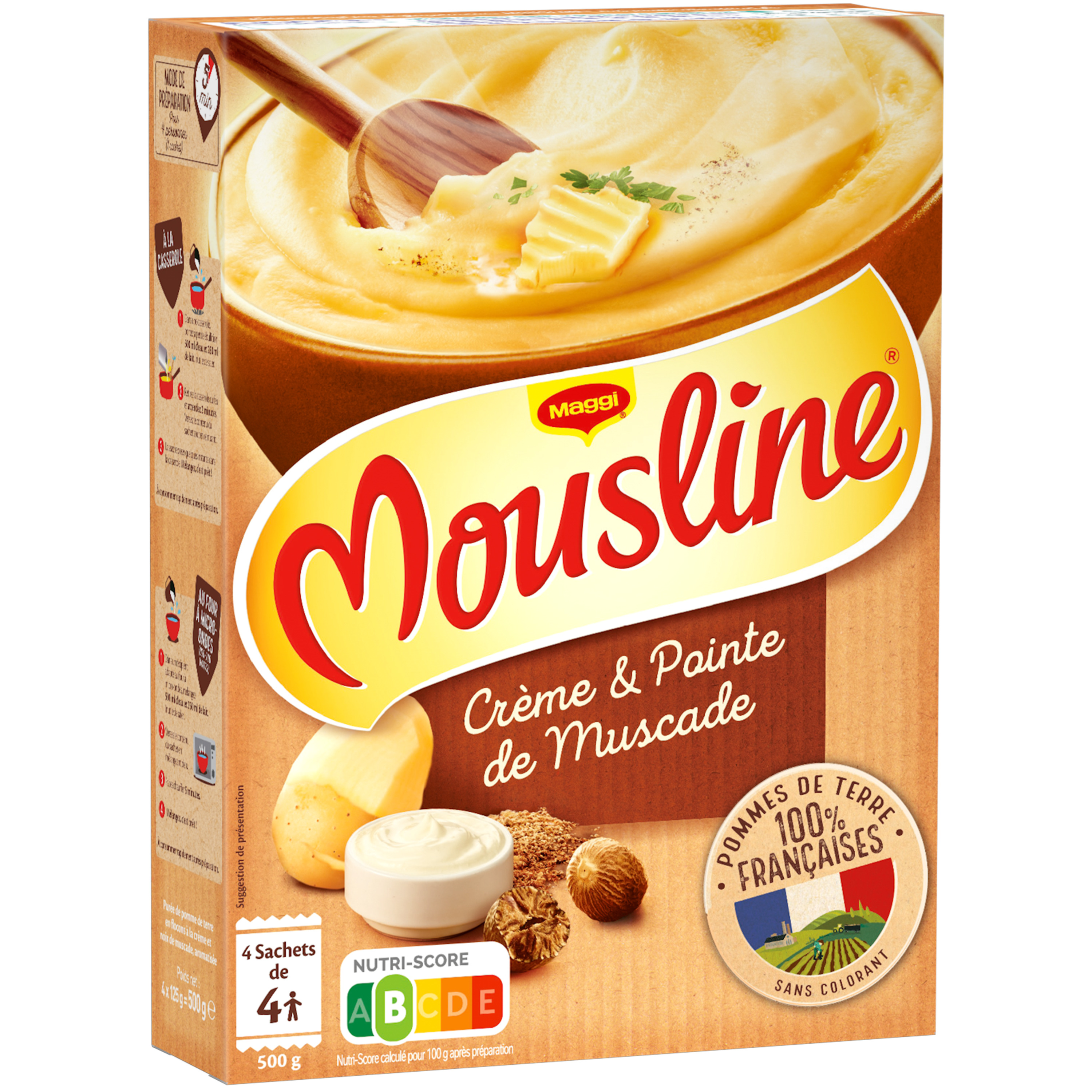 Ingrédients: Pomme de terre 90%, CREME en poudre (LAIT) 3,5%, sel, fécule de pomme de terre, BEURRE de cuisine (LAIT), émulsifiant : mono- et diglycérides d'acides gras (origine végétale) ; curcuma, oignon, noix de muscade, arômes (LAIT), antioxydant : extraits de romarin ; arômes naturels de noix de muscade et de poivre.