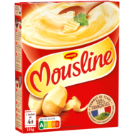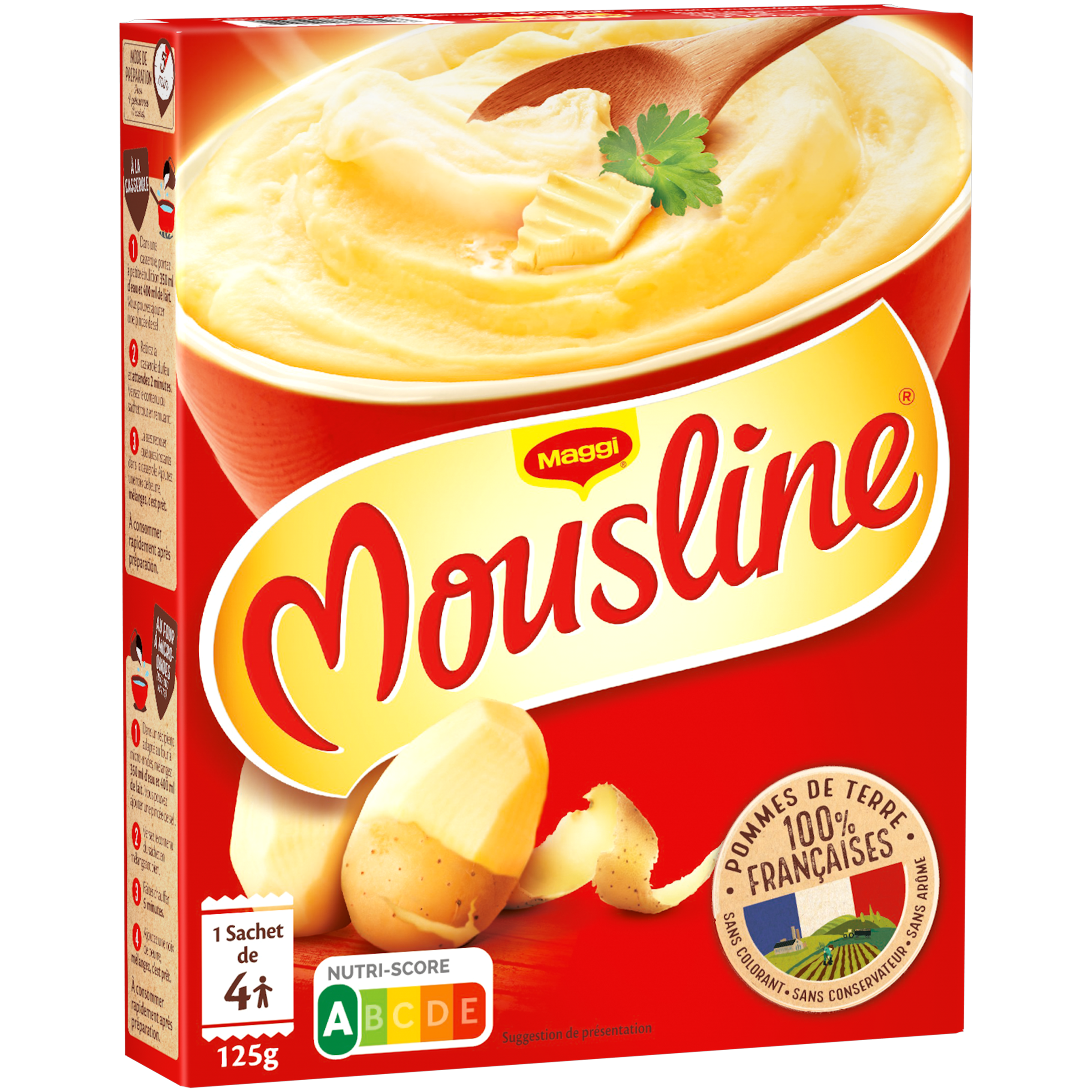 La purée préférée des Français. Une purée onctueuse au goût unique, préparée avec 99% de pommes de terre françaises. Les pommes de terre, majoritairement récoltées en Picardie, sont livrées à l'atelier de fabrication MOUSLINE. Elles sont soigneusement lavées, épluchées puis cuites à la vapeur. Elles sont ensuite écrasées en purée, dont on extrait l'eau pour la réduire en flocons. Sans colorant. Sans conservateur. Sans arôme. Produite en Picardie. Carton recyclable. Une boite contient 1 sachet pour 4 personnes. Purée de pomme de terre en flocons