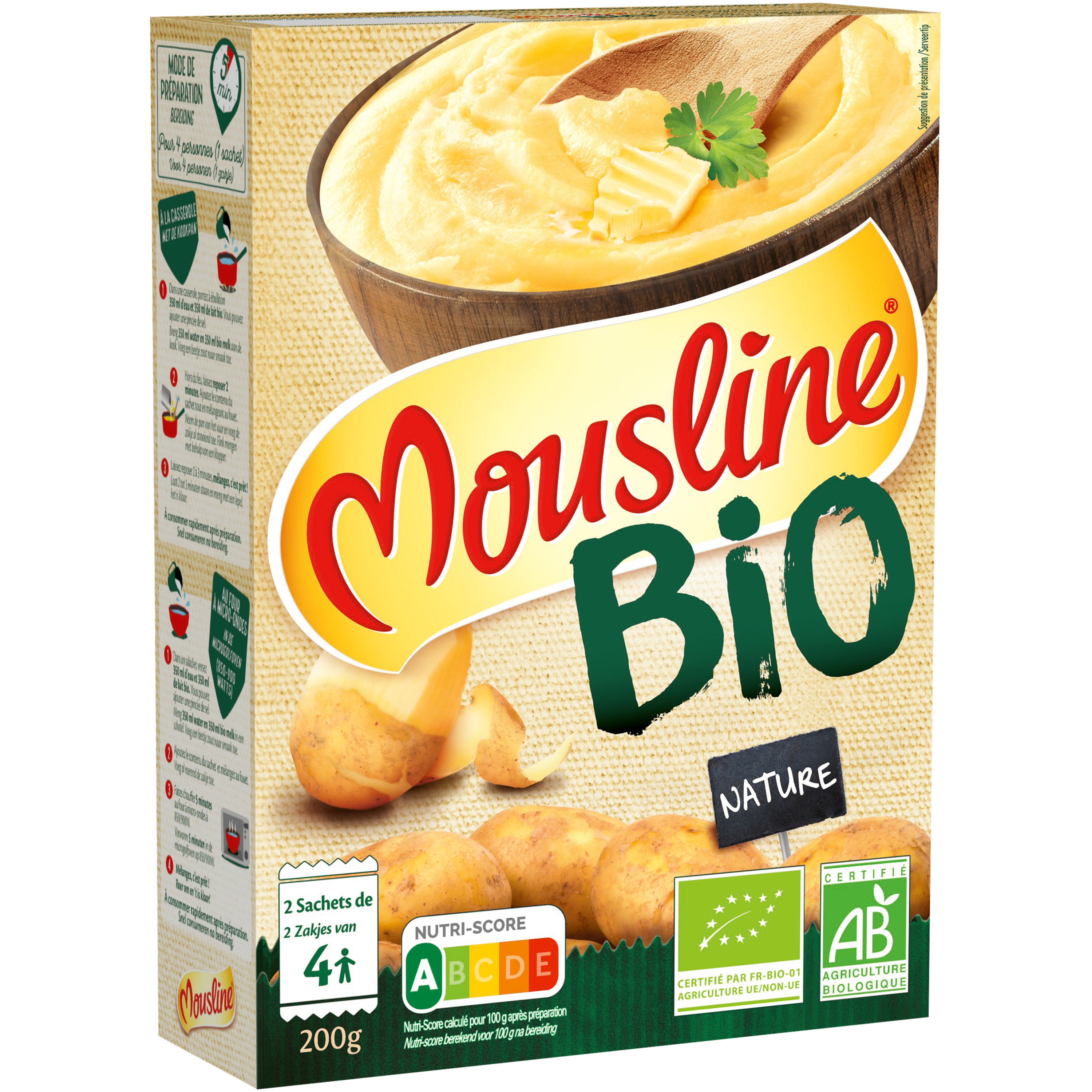 5 minutes, pour 4 personnes (1 sachet). A la casserole : Dans une casserole, portez à ébullition 350 ml d'eau et 350 ml de lait bio. Vous pouvez ajouter une pincée de sel. Hors du feu, laissez reposer 2 minutes. Ajoutez le contenu du sachet tout en mélangeant au fouet. Laissez reposer 2 à 3 minutes, mélangez, c'est prêt ! A consommer rapidement après préparation. Au four à micro-ondes (850-900 watts) : Dans un saladier, versez 350 ml d'eau et 350 ml de lait bio. Vous pouvez ajouter une pincée de sel. Ajoutez le contenu du sachet et mélangez au fouet. Faites chauffer 5 minutes au four à micro-ondes à 850/900W. Mélangez, c'est prêt ! A consommer rapidement après préparation.