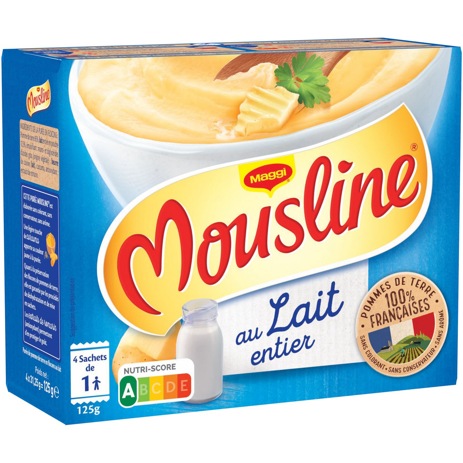 Ingrédients: Pomme de terre 85%, LAIT entier en poudre 12,5%, émulsifiant : mono- et diglycérides d'acides gras (origine végétale) ; BEURRE de cuisine (LAIT), curcuma, antioxydant : extraits de romarin.