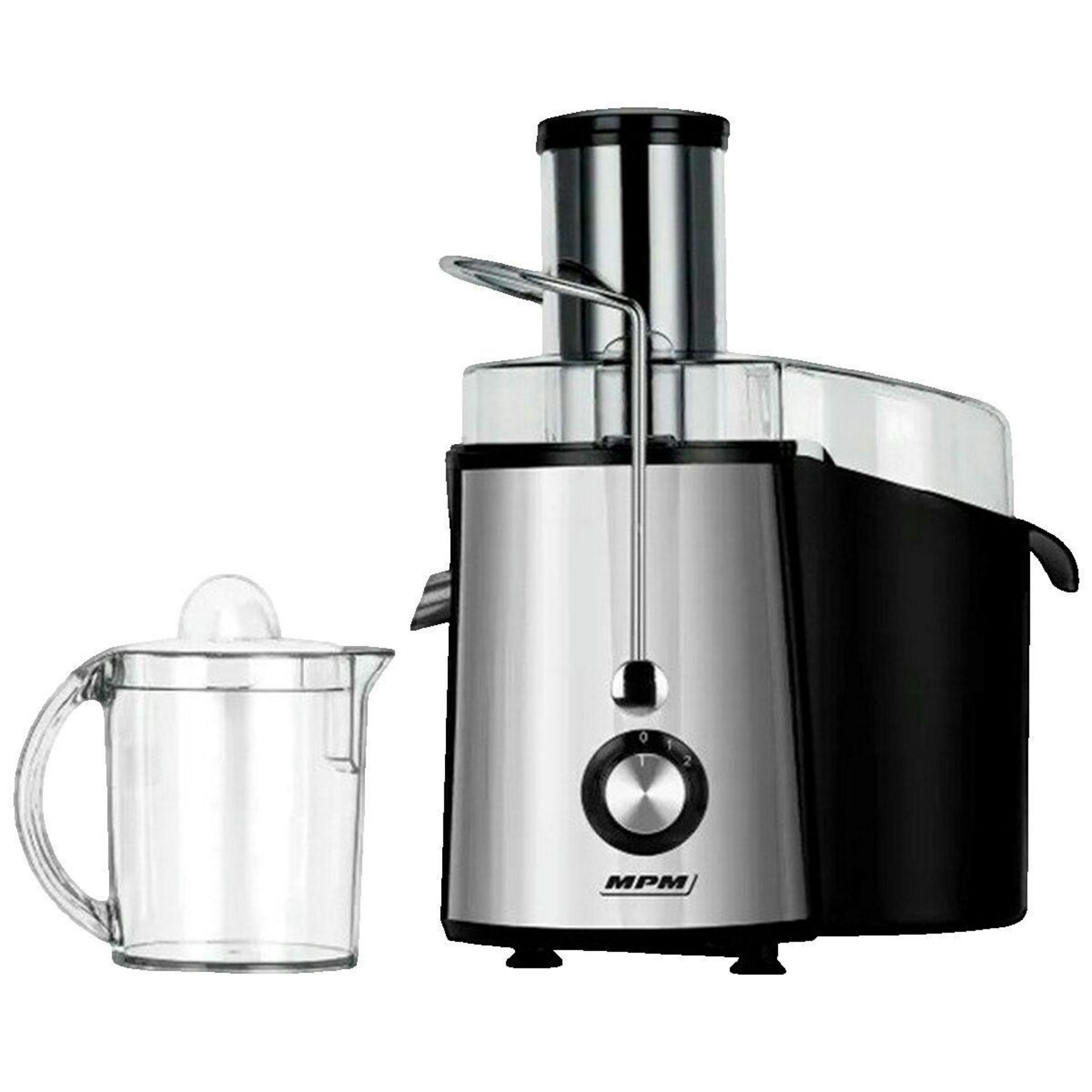 Découvrez la centrifugeuse MPM MSO-18M en acier inoxydable, conçue pour la préparation de jus frais à domicile. Avec une puissance de 1000 W et une ouverture large de 85 mm, elle permet de presser facilement fruits et légumes entiers. Elle dispose d'une capacité de 1 L pour le récipient à jus et 2 L