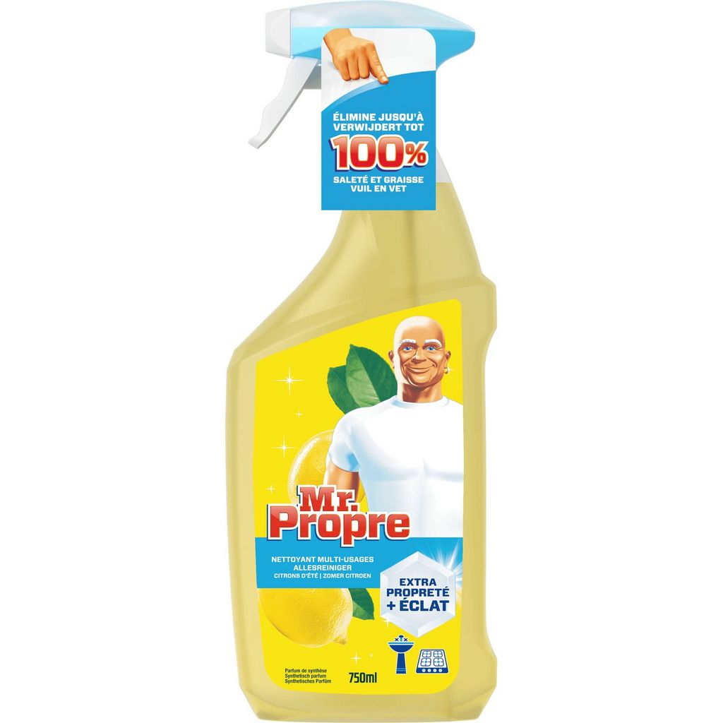 Le Spray Nettoyant Multi-Usages Mr. Propre est idéal pour nettoyer presque toutes les surfaces dures de votre intérieur. Utilisez-le pour nettoyer l’évier de votre cuisine, une plaque de cuisson couverte de graisse et même le sol. Instructions complètes d’utilisation sur la bouteille. Il est nécessaire de rincer toutes les surfaces en contact direct avec de la nourriture.