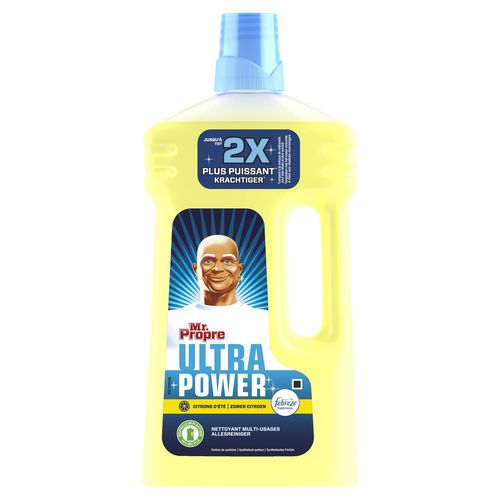 Mr. Propre Ultra Power Citrons d’été Nettoyant Multi-Usages Puissant 1 l Le nettoyant multi-usages Mr. Propre Ultra Power est idéal pour nettoyer pratiquement toutes les surfaces dures de votre maison. Utilisez-le pour nettoyer l’évier, les cuisinières graisseuses, et les sols. Voir l’emballage pour les consignes d’utilisation détaillées.