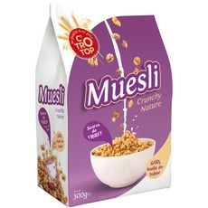 MUESLI CRUNCHY Nature C'TROTOP sachet 500g mélange croustillant grâce aux flocons d'avoine, de blé et de maïs. Recette enrichie de 9 vitamines pour un petit déjeuner équilibré