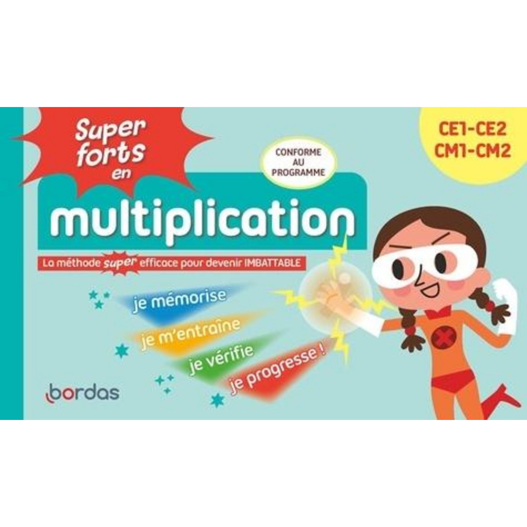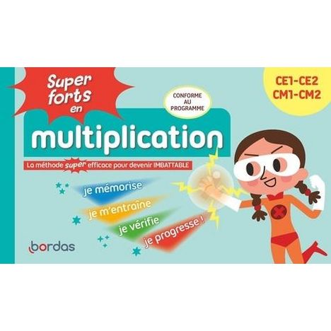 Super forts en Multiplication : un support inédit de fiches détachables pour s'entraîner en autonomie et devenir imbattables en tables de multiplication ! Grâce à ce support innovant de 45 fiches détachables, destiné aux élèves du CE1, du CE2, du CM1 et du CM2, v otre enfant pourra apprendre ses tables de multiplications, réviser en autonomie et à son rythme grâce au système d'autocorrection et progresser en fluence de calcul ! Une méthode auto-corrective, efficace et stimulante s'appuie sur la répétition et la réactivation de la mémoire conformément aux recommandations des neurosciences. Une méthode développée pour l'école et utilisée en alte reposant sur : - La mémorisation par la répétition - Une progression douce pour consolider les acquis - Un engagement court ne dissuadant par les enfants - L'autocorrection pour travailler en autonomie - Le chronométrage pour gagner en fluence de calcul Conçues pour favoriser la mémorisation, ces fiches détachables se décomposent en plusieurs zones d'apprentissage : - La copie - La révision - L'entraînement - L'évaluation - Le chronométrage. Le dispositif d'autocorrection par pliage est intégré à chaque fiche, permettant ainsi à l'enfant s'évaluer seul et de progresser à son rythme. Ce support complet facilement transportable est idéal pour être utilisé toute l'année. Les + : - Un système inventif, unique et exclusif d'autocorrection - Une maquette à l'aspect ludique et attractif - Un format pratique idéal pour des entraînements réguliers, - Un univers de super-héros et super-héroïne auquel s'identifier - Des fiches qui mixent toutes les tables à la fin - Des indications de temps pour estimer sa fluence en calcul - Un mode d'emploi simple et facile à maîtriser par l'enfant - Un suivi des résultats pour apprécier son progrès - Un flip book amusant au dos des fiches