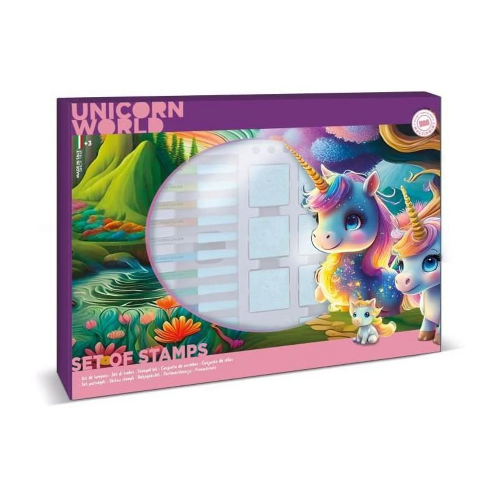 Coffret de tampons - MULTIPRINT - 4978 - Licornes - 7 tampons bois et latex, 12 feutres Giotto, regle, album coloriage