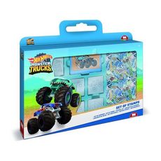 Le set comprend 3 feutres Giotto aux couleurs vives, un album de coloriage thématique Hot Wheels et un tampon encreur rechargeable avec encre lavable non toxique. Les dimensions généreuses (33 x 27 cm) permettent une utilisation confortable.