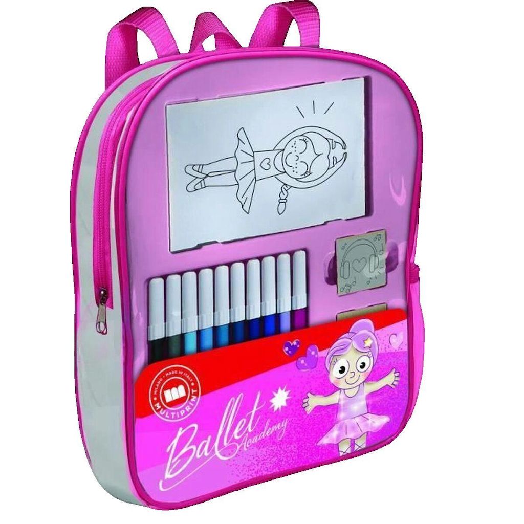 Le sac à dos MULTIPRINT 24106, de couleur rose, est conçu pour stimuler la créativité des enfants dès 3 ans. Il comprend 4 tampons en bois avec latex naturel, un tampon encreur avec encre lavable et non toxique, 10 feutres Giotto de haute qualité, un livret d'activités et 30 stickers. Ce sac durable