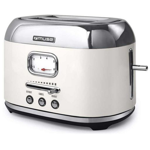 Muse MS-120SC Grille-pain de style rétro 2 fentes MS120SC de MUSE. Doté de 6 niveaux de brunissement pour un pain uniformément grillé des 2 côtés, avec fonction d'annulation. Surélévation pour un retrait des petites tranches en toute sécurité. - Type de produit : Grille-pains.Puissance (W) : 1000.No