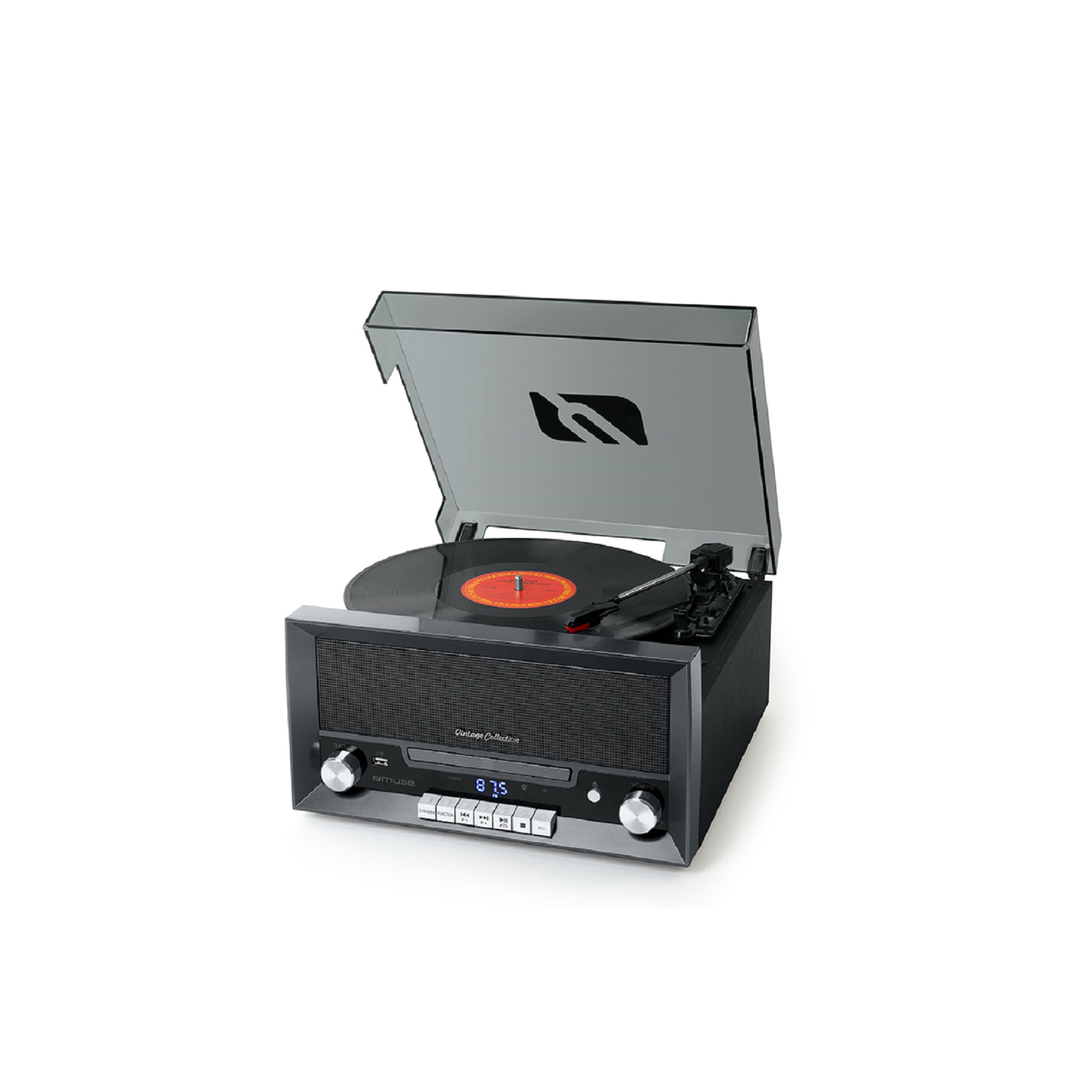 D'un encombrement réduit (33 x 32 x 17,5 cm) et d'un poids de 3,71 kg, ce système conserve une construction robuste avec sélecteur de vitesse mécanique (33/45/78 tours) et commandes tactiles intuitives. Le design sobre en plastique noir s'adapte à tous les intérieurs, des chambres d'étudiants aux salons design.