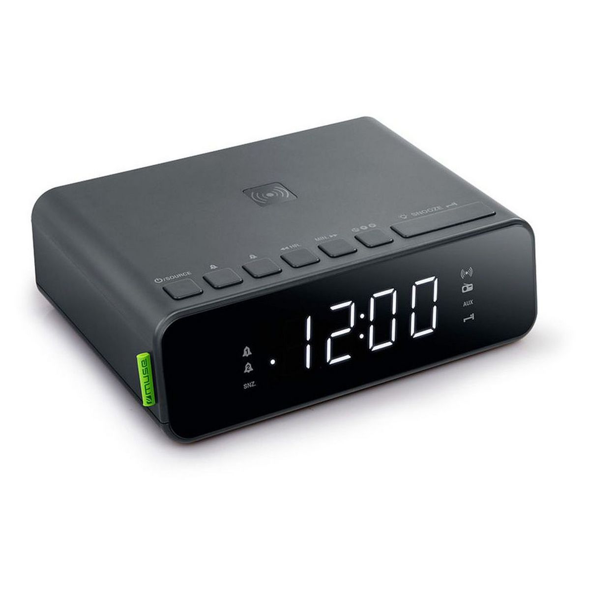 Radio PLL FM - Affichage LED - Intensité lumineuse réglable - Double alarme - Fonction Sleep - Chargement sans fil 5W et port USB de chargement pour smartphone - Entrée Aux 3.5 mm - Entrée CC - Adaptateur secteur